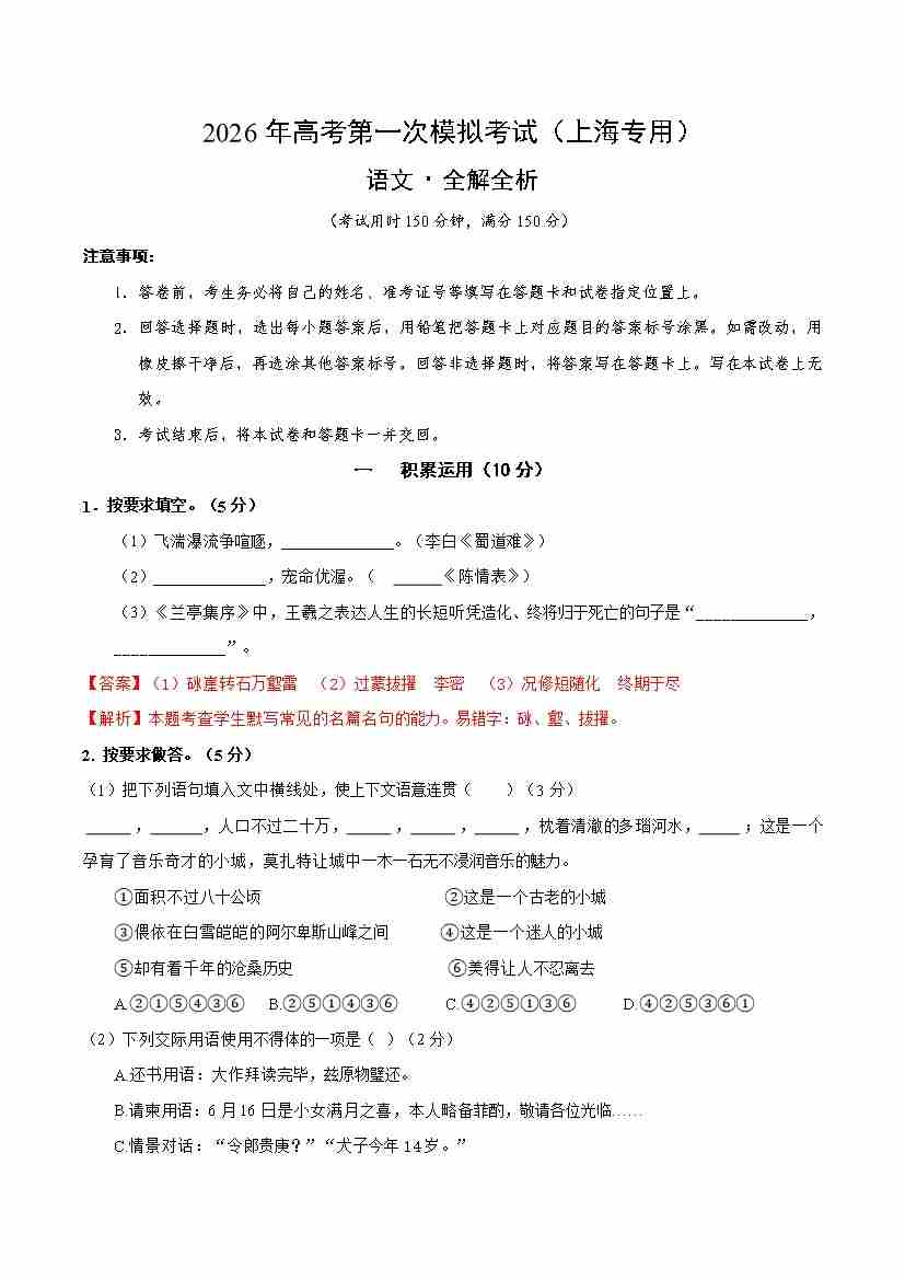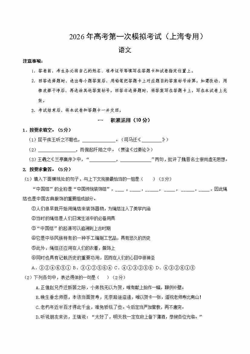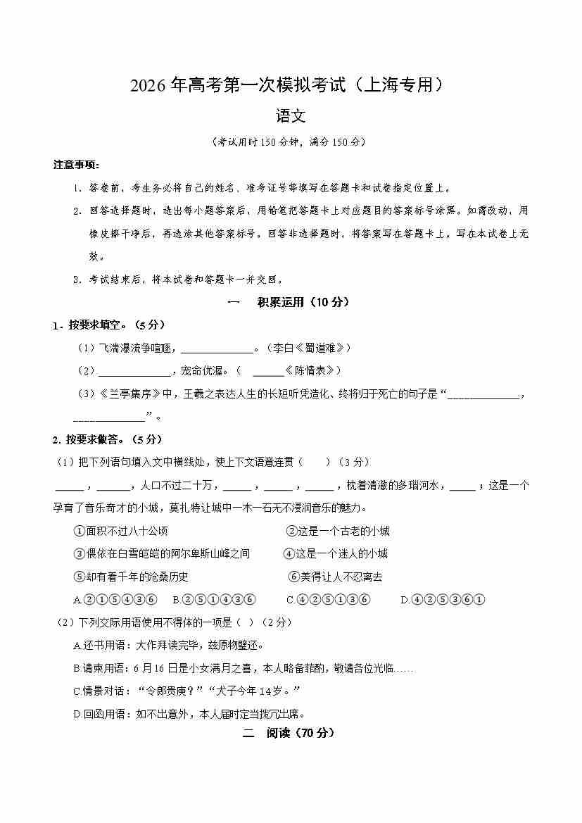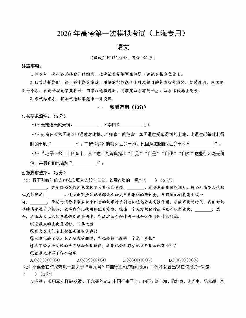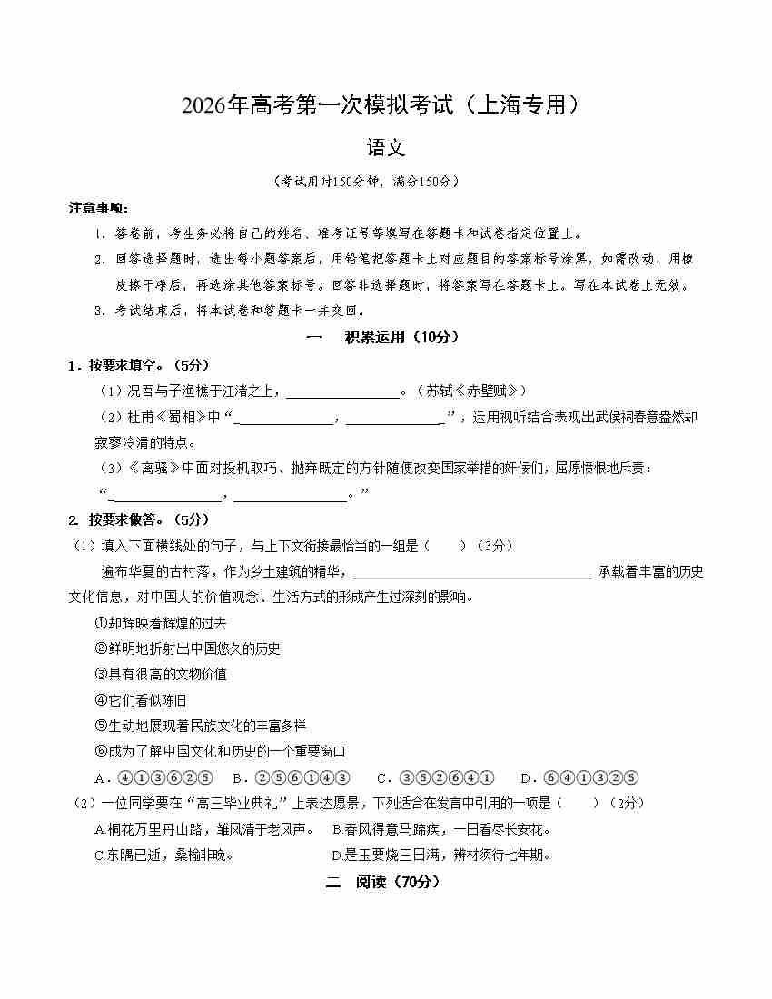 语文高考一模提分卷02(上海专用)(考试版A4)