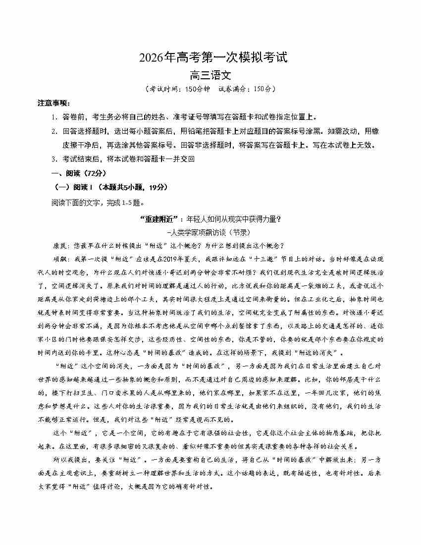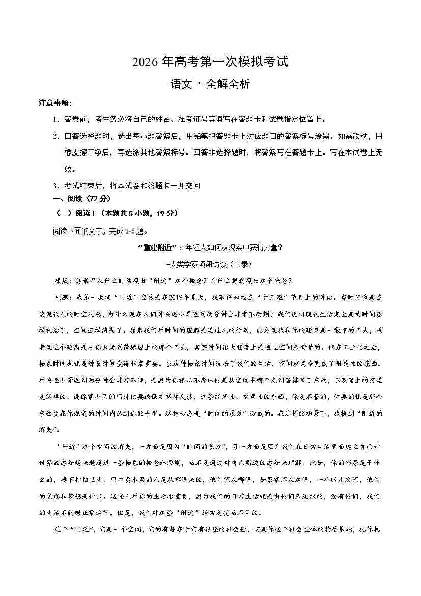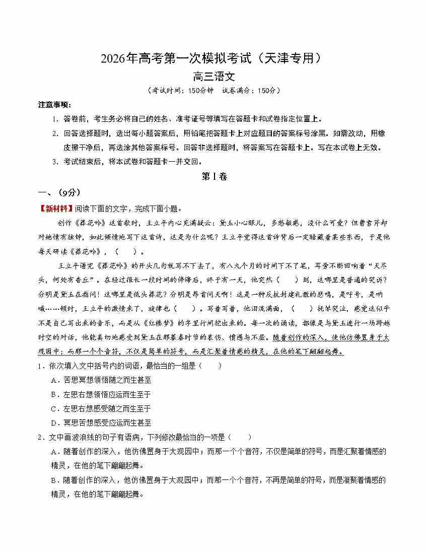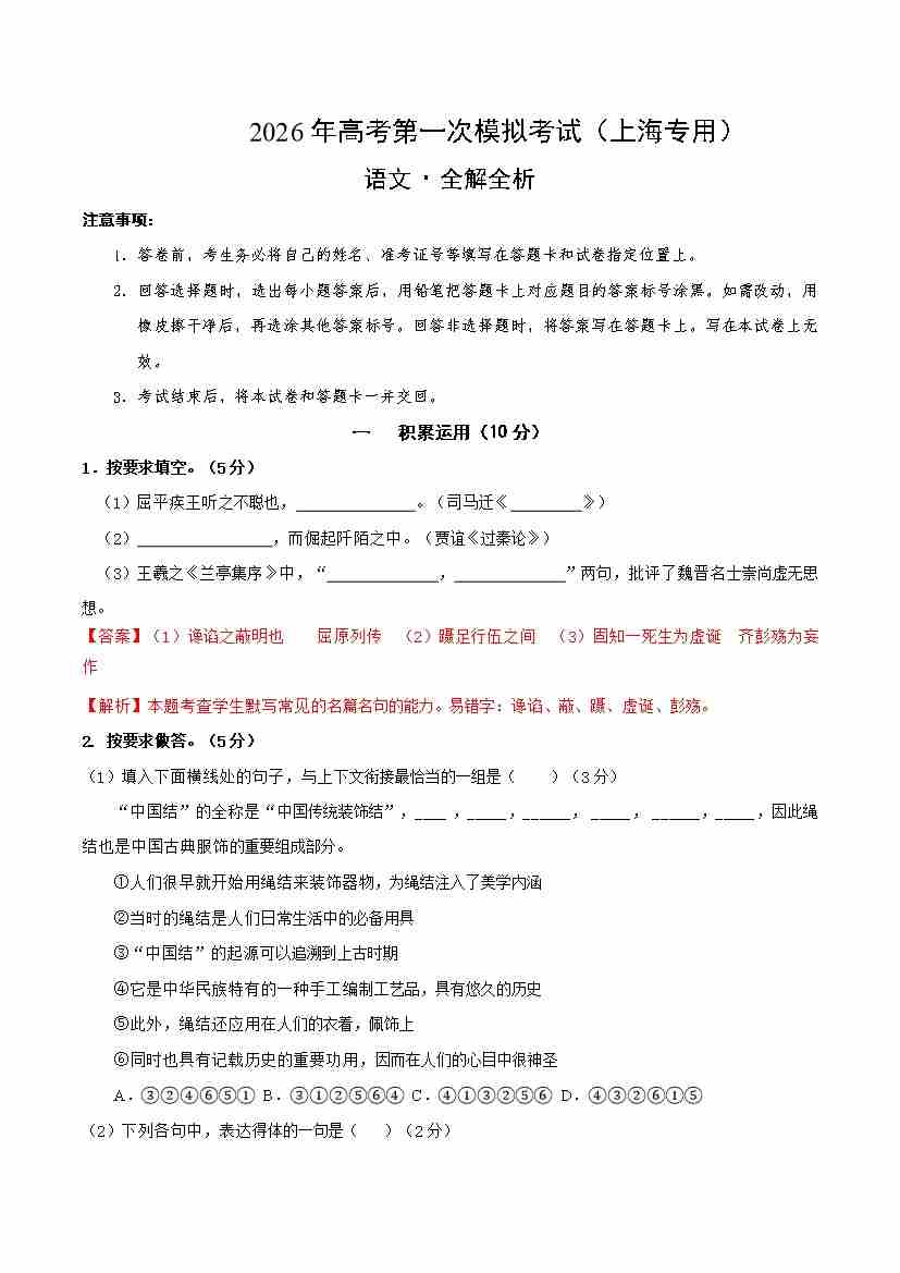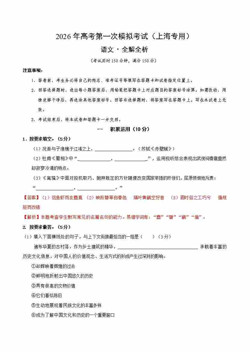 语文高考一模提分卷02(上海专用)(考试版A4)