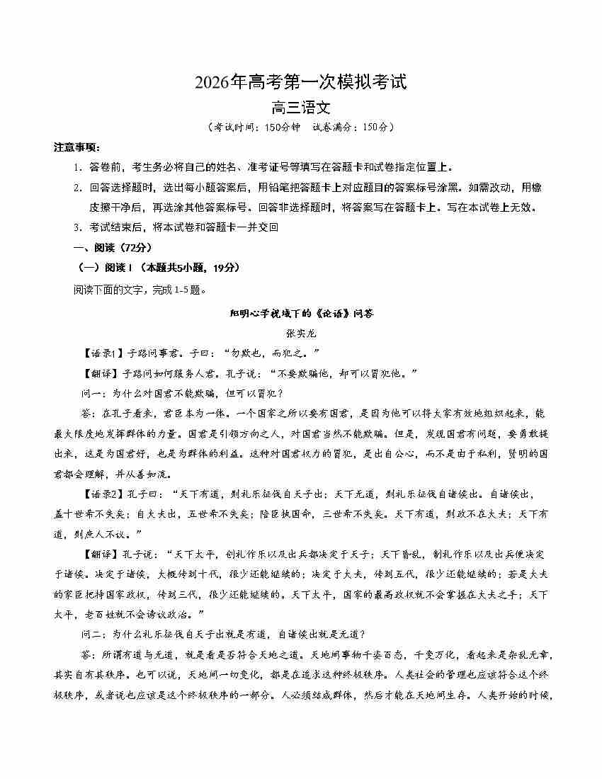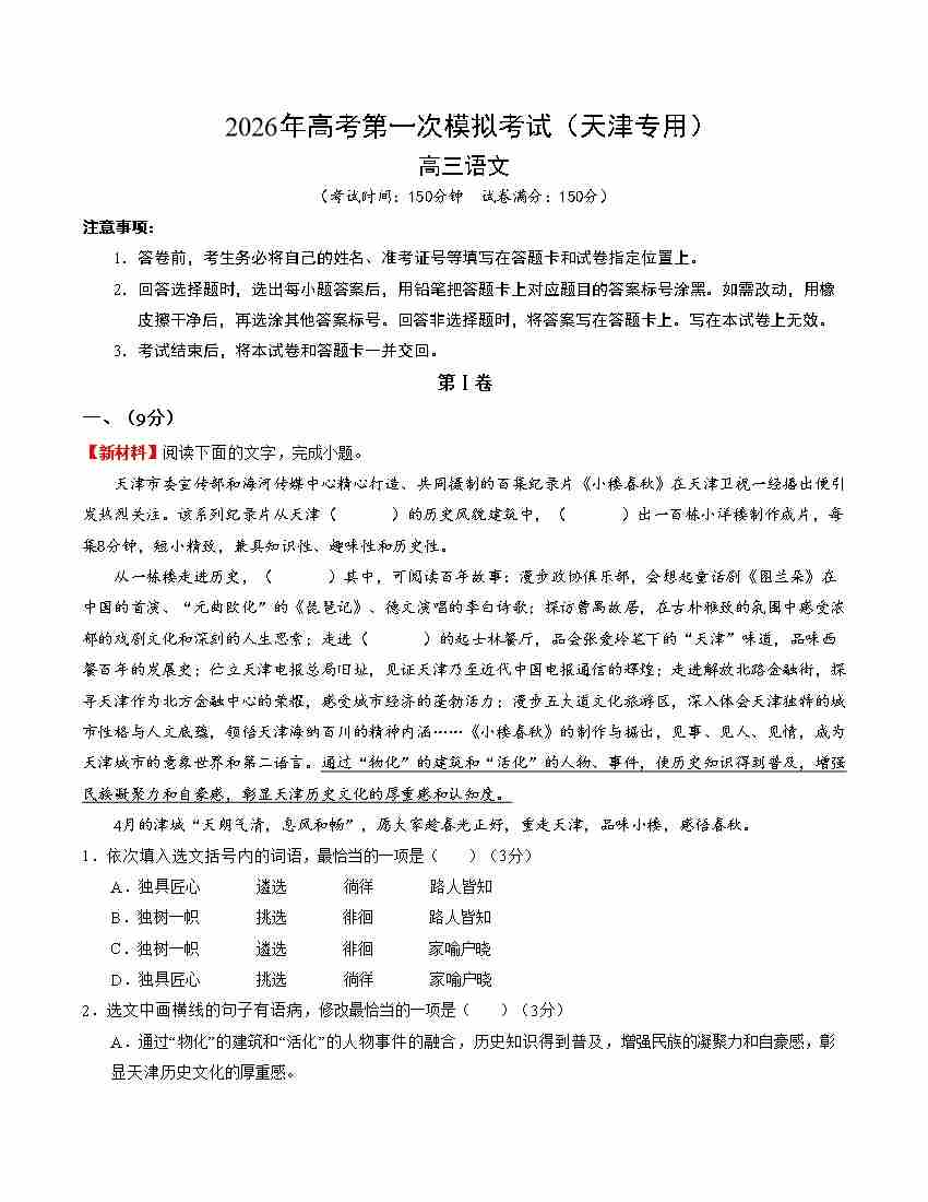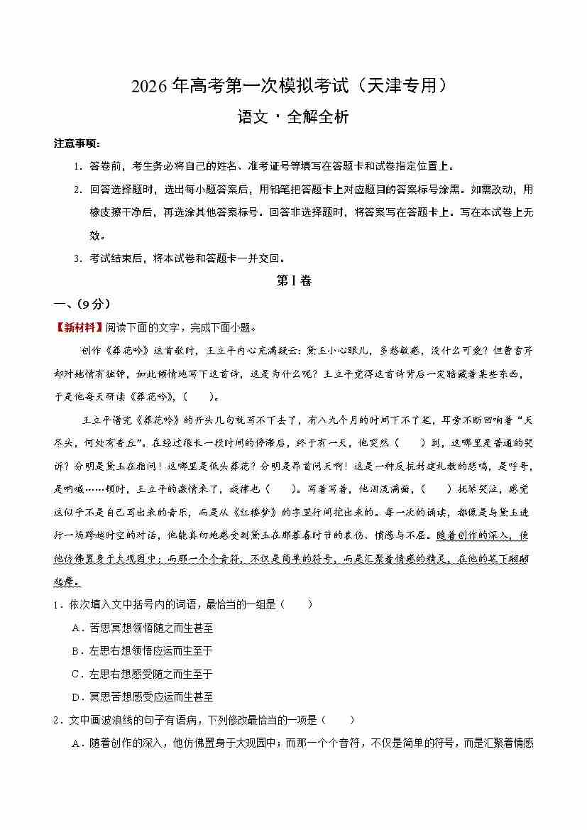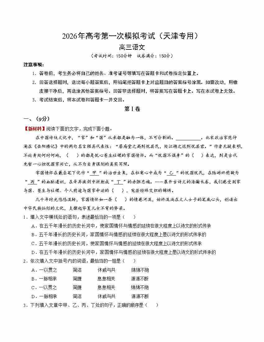 语文高考一模提分卷03(上海专用)(考试版A4))