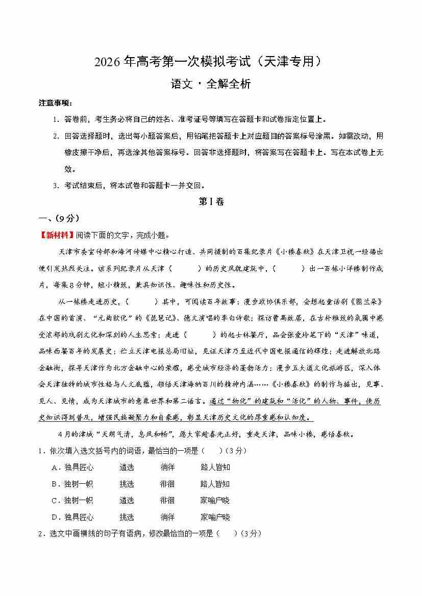 语文一模高考提分卷04(上海专用)(考试版A4)