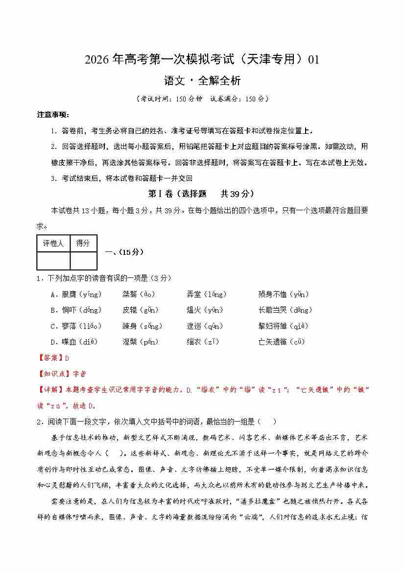 语文一模保分卷01(天津专用)(全解全析)