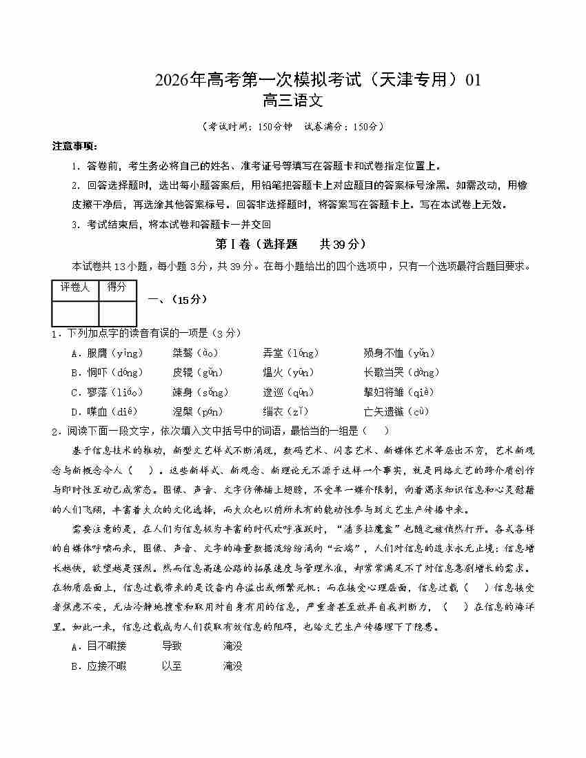 语文一模保分卷01(天津专用)(考试版A4)