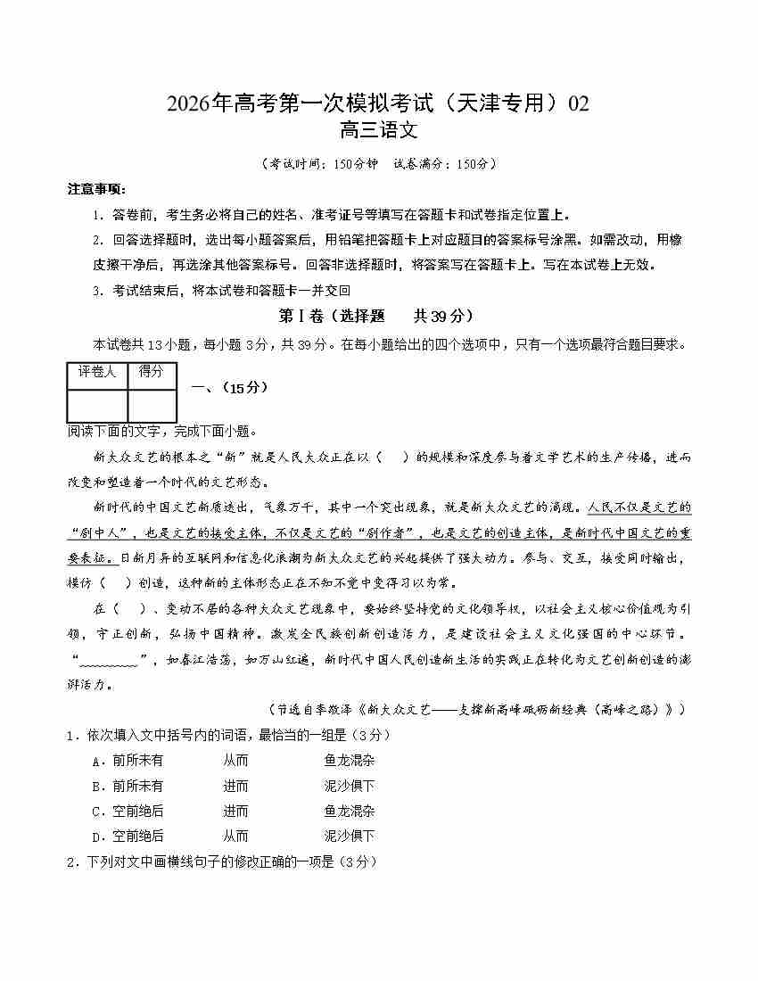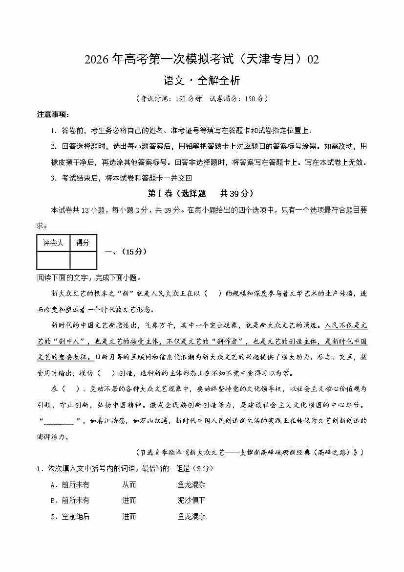 语文一模保分卷02(天津专用)(考试版A4)