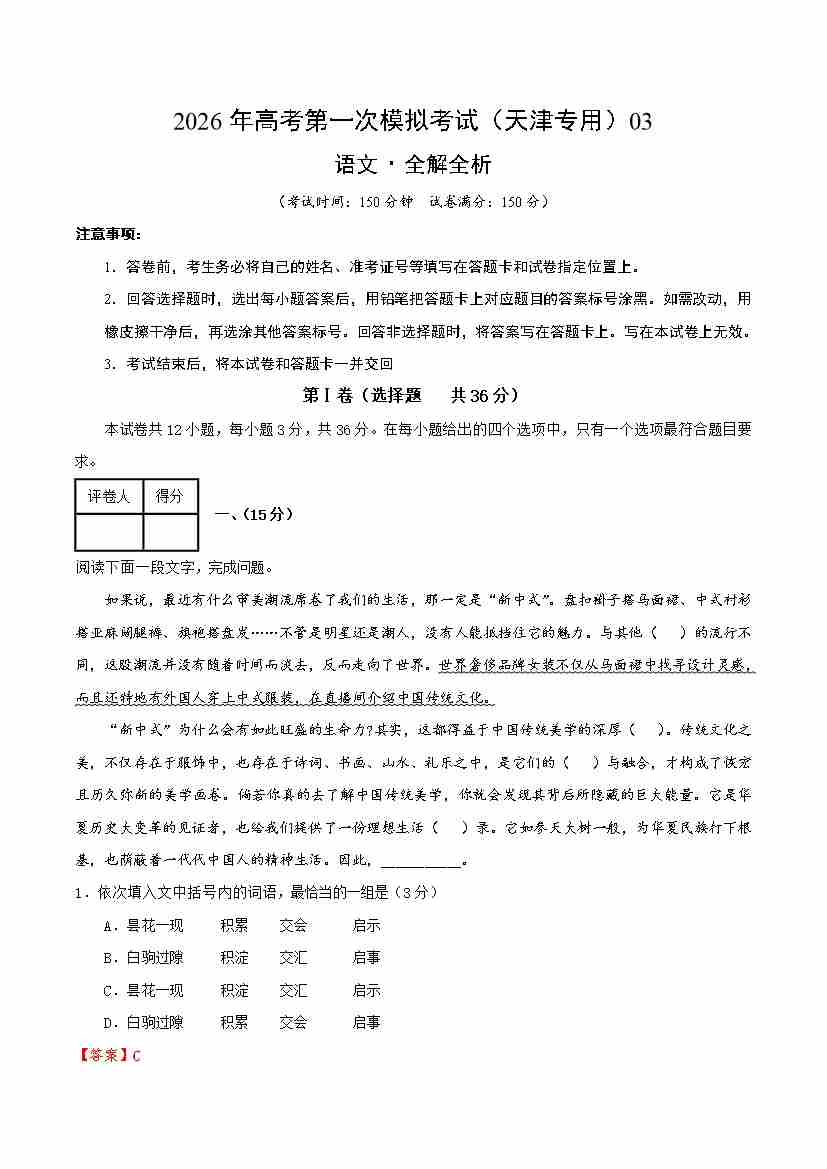 语文一模保分卷03(天津专用)(全解全析)