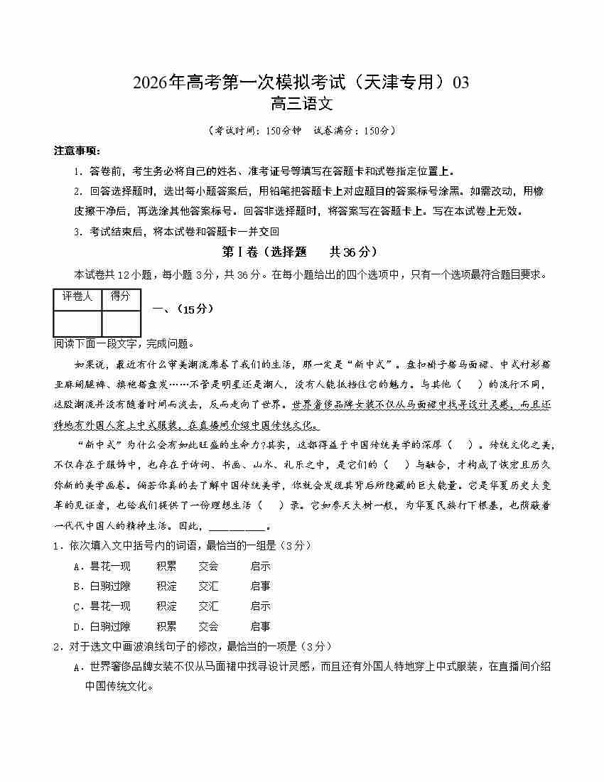 语文一模保分卷03(天津专用)(考试版A4)
