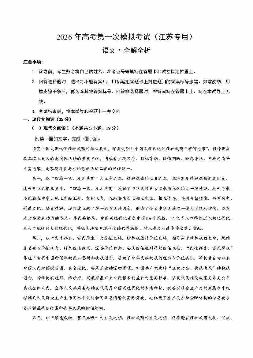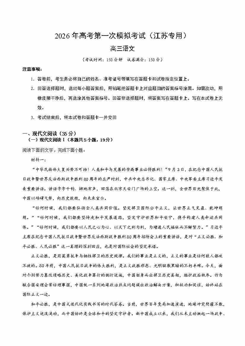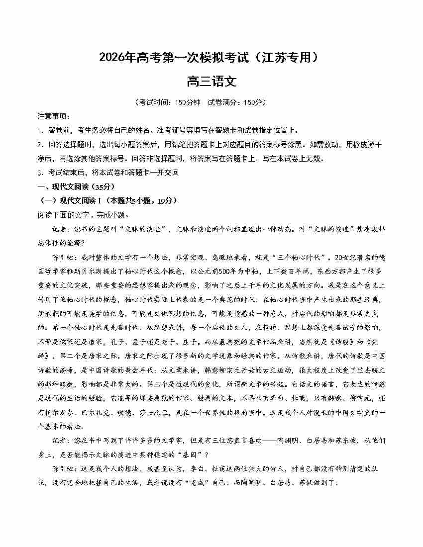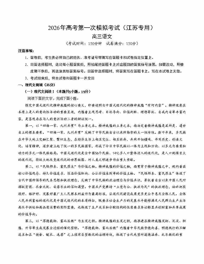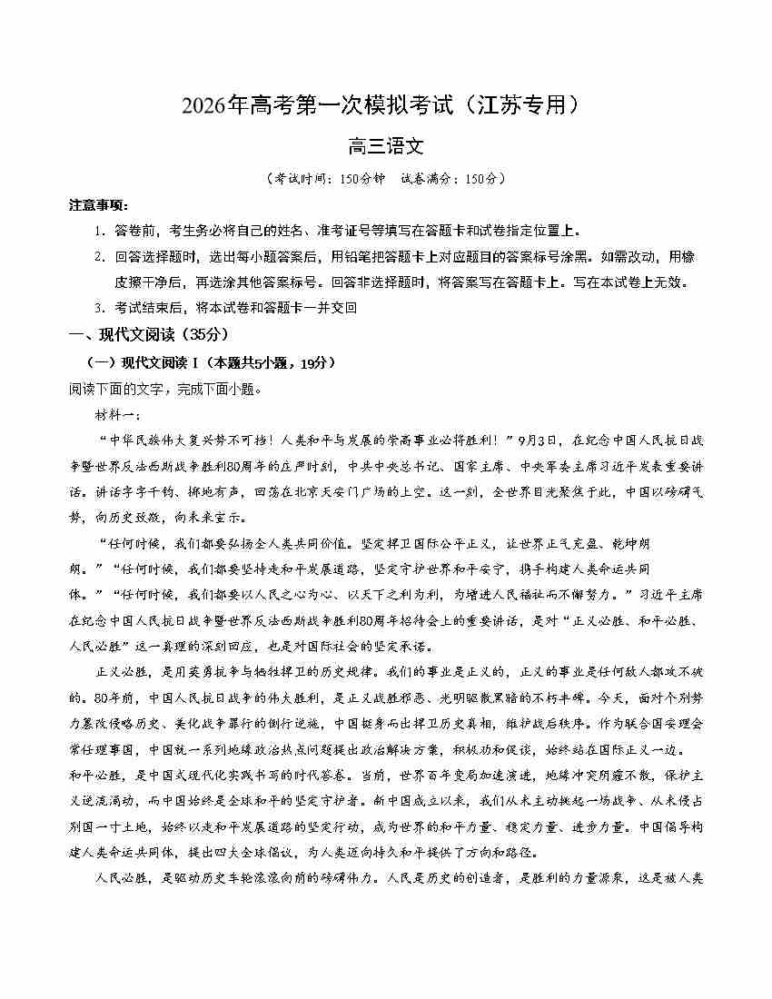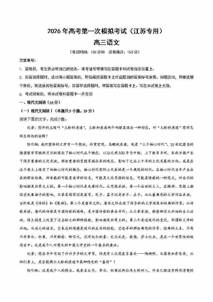 语文一模提分卷01(江苏专用)(考试版A4)