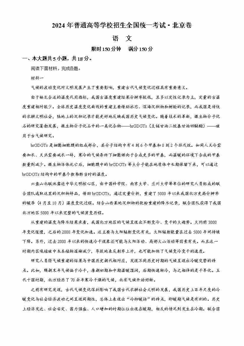 精品解析:2024年北京卷语文(原卷版)