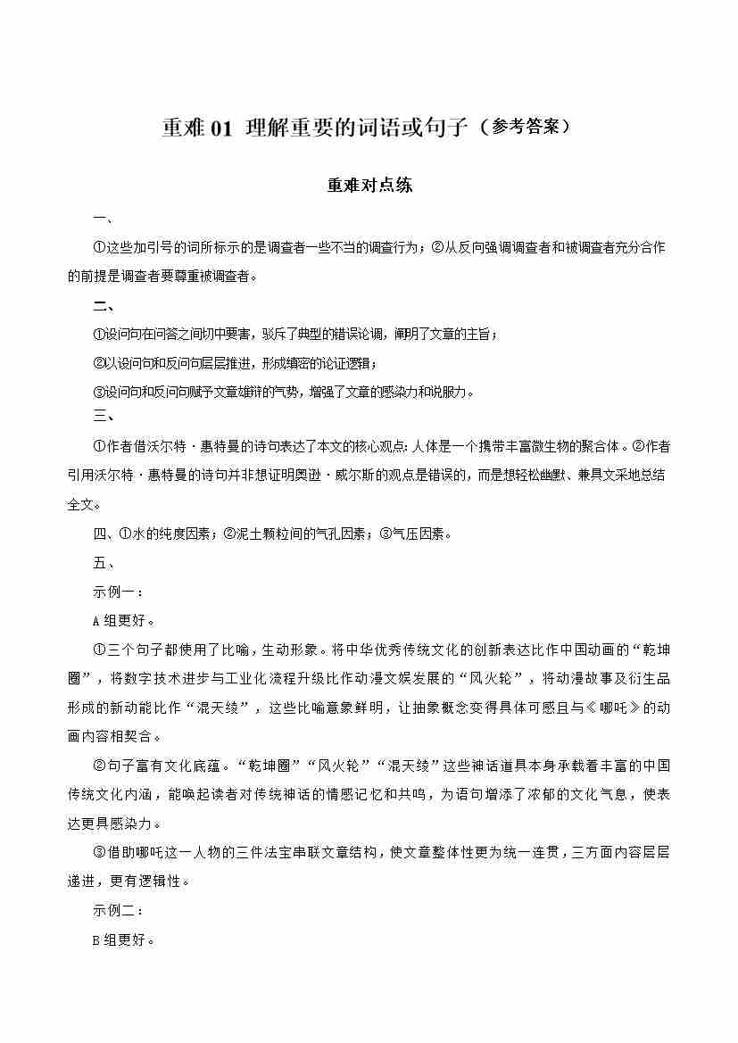 重难01 理解重要的词语或句子(重难专练)(全国通用)(答案版)
