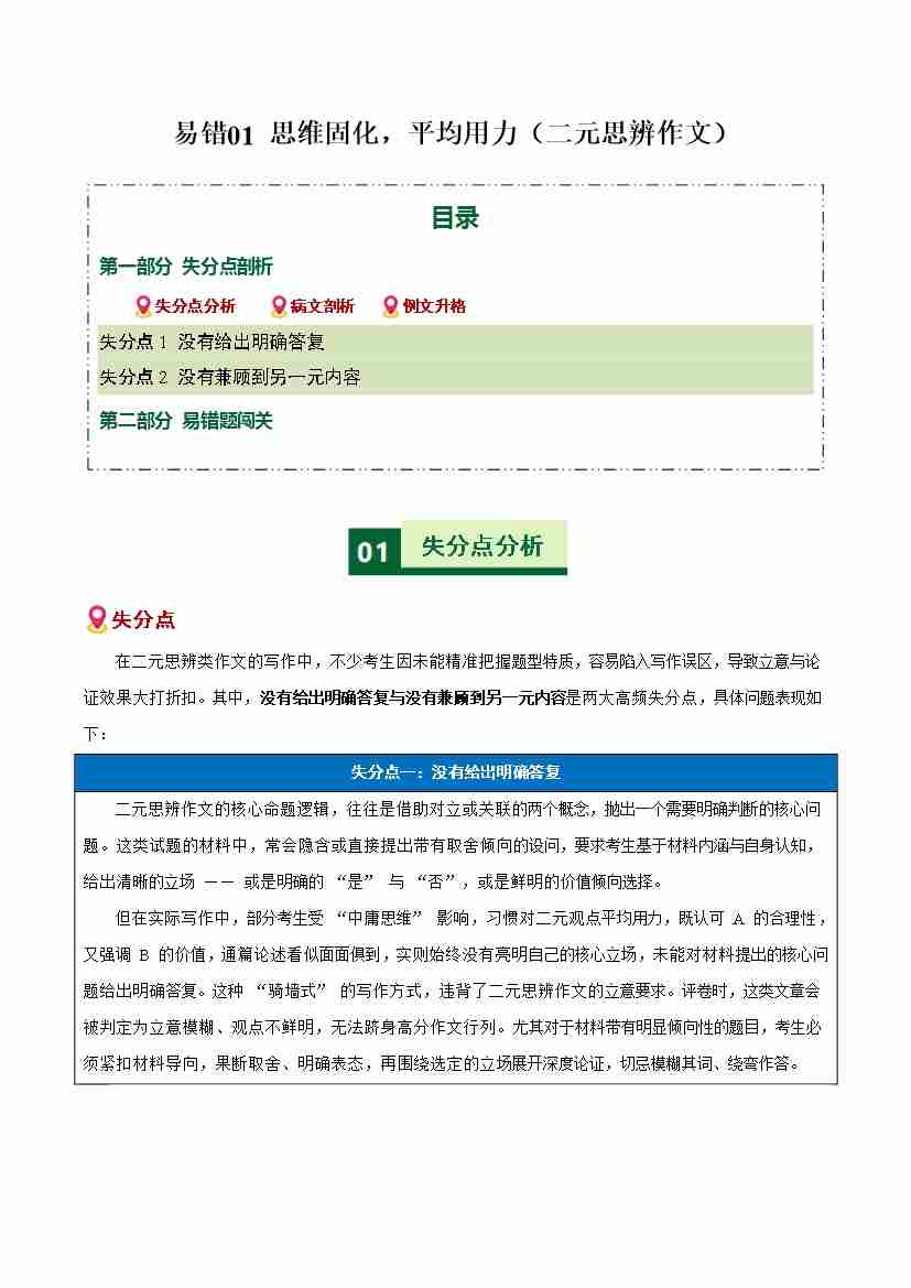 易错01 思维固化,平均用力(二元思辨作文)(易错专练)(全国通用)(学生版)