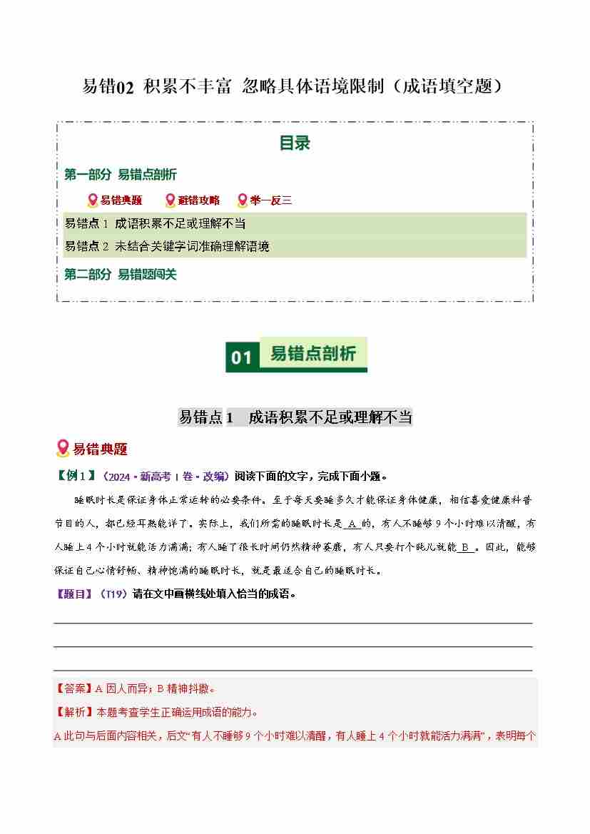 易错02 (成语填空题)积累不丰富 忽略具体语境限制(易错专练)(全国通用)(教师版)