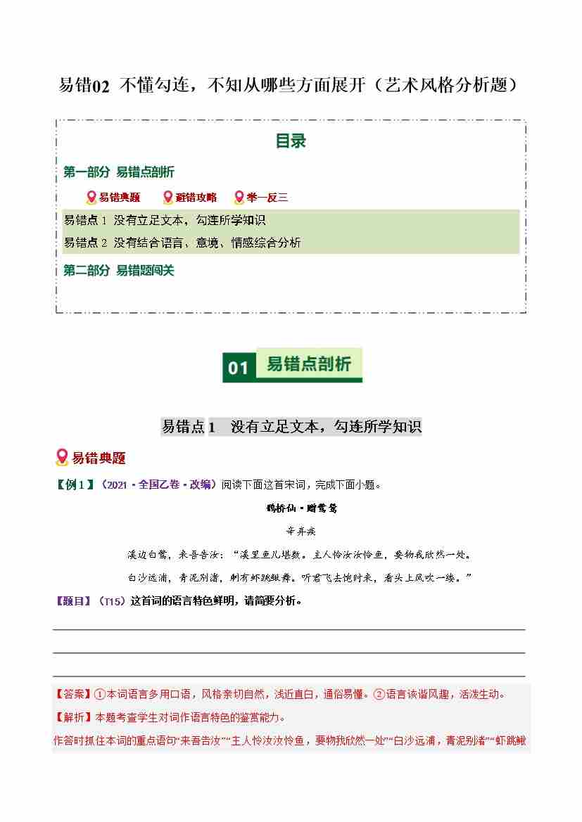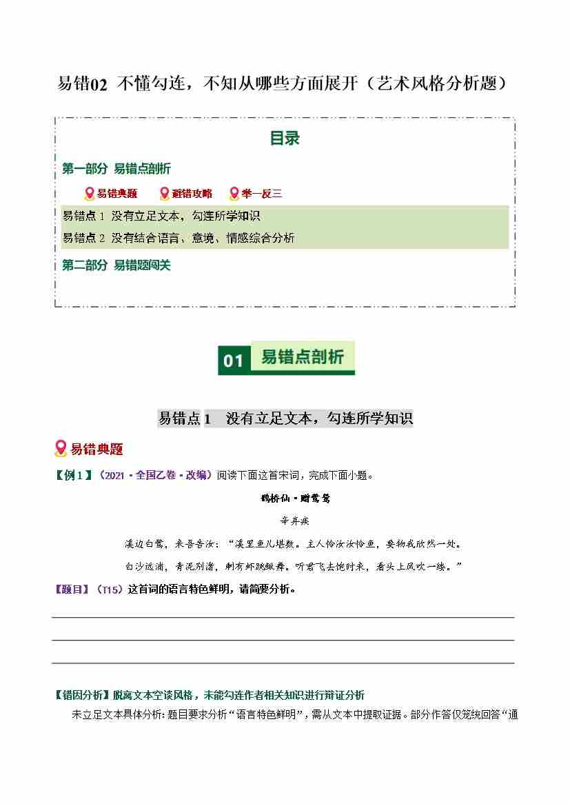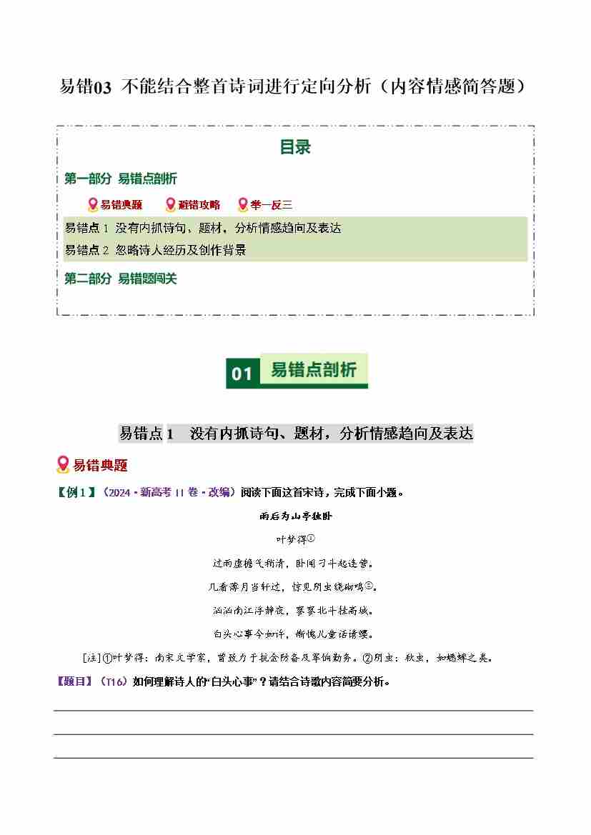 易错03 (内容情感简答题)不能结合整首诗词进行定向分析(易错专练)(全国通用)(学生版)