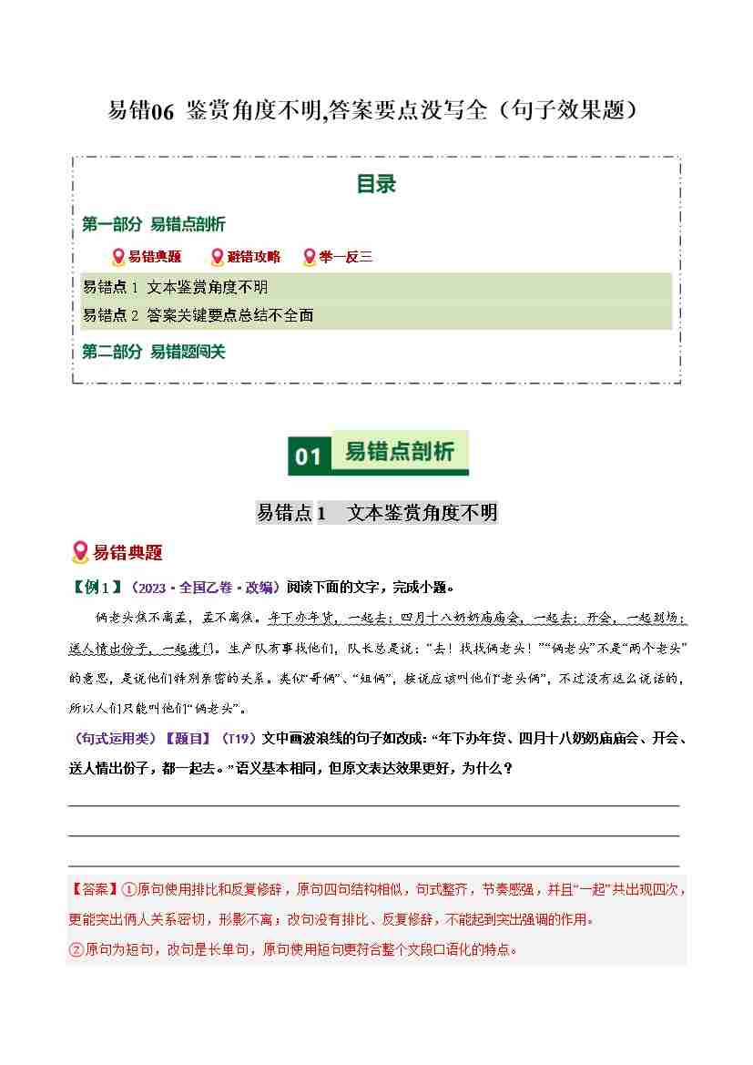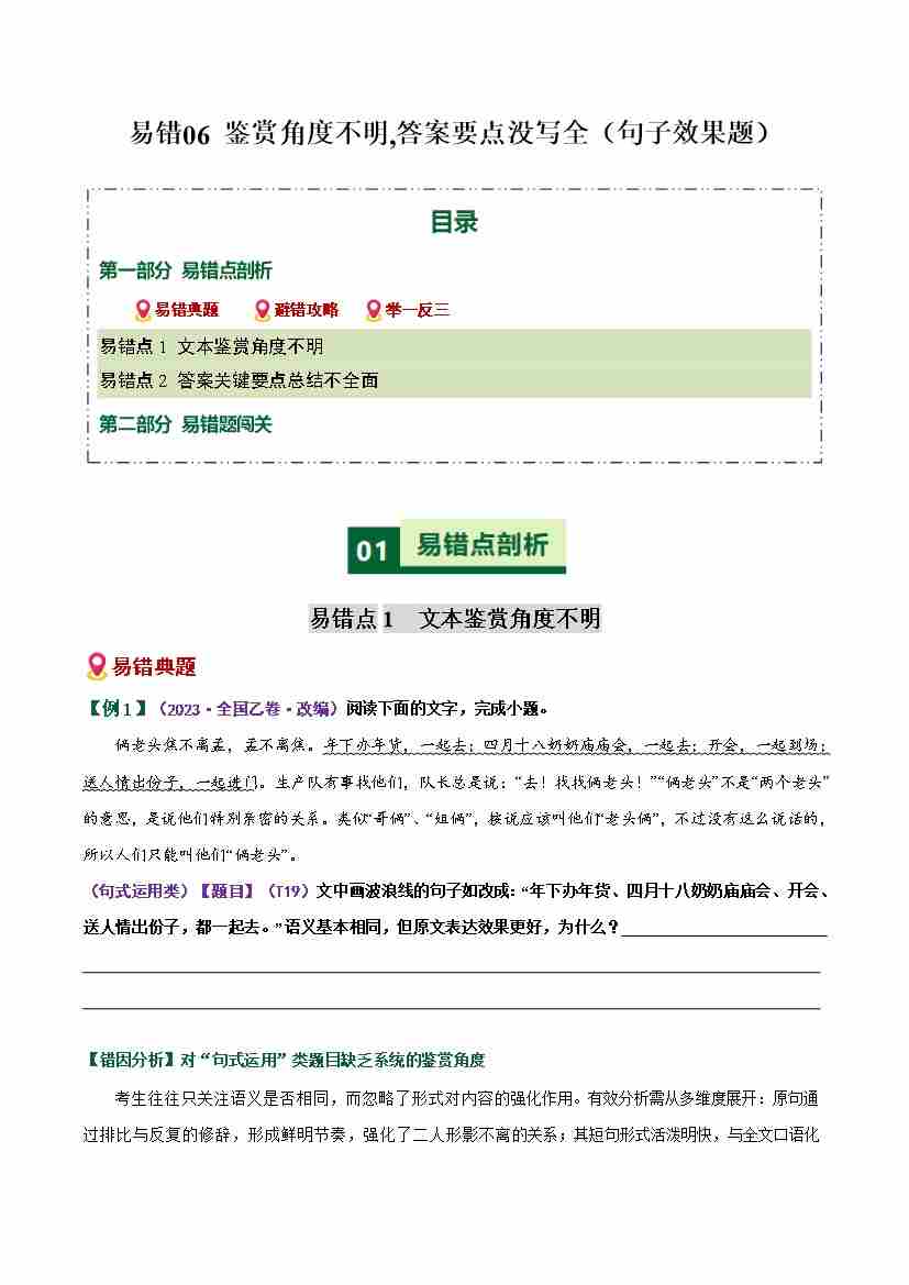 易错06 (句子效果题)鉴赏角度不明,答案要点没写全(易错专练)(全国通用)(学生版)