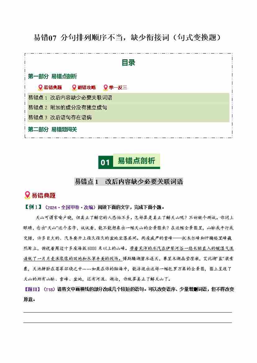 易错07 (句式变换题)分句排列顺序不当,缺少衔接词(易错专练)(全国通用)(学生版)