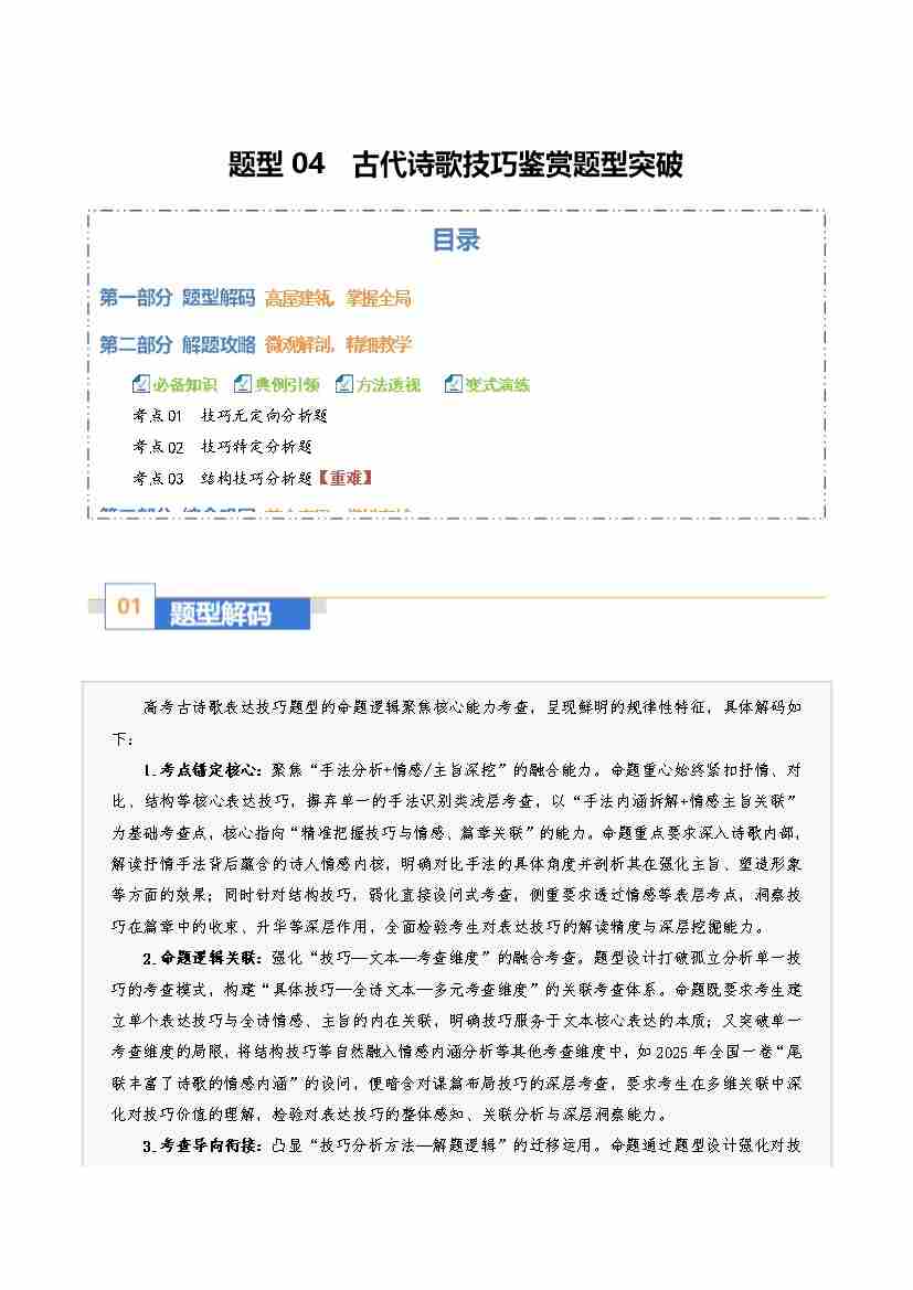 题型04 古代诗歌技巧鉴赏题型突破(题型专练)(全国通用)(学生版)