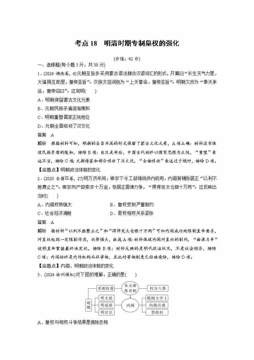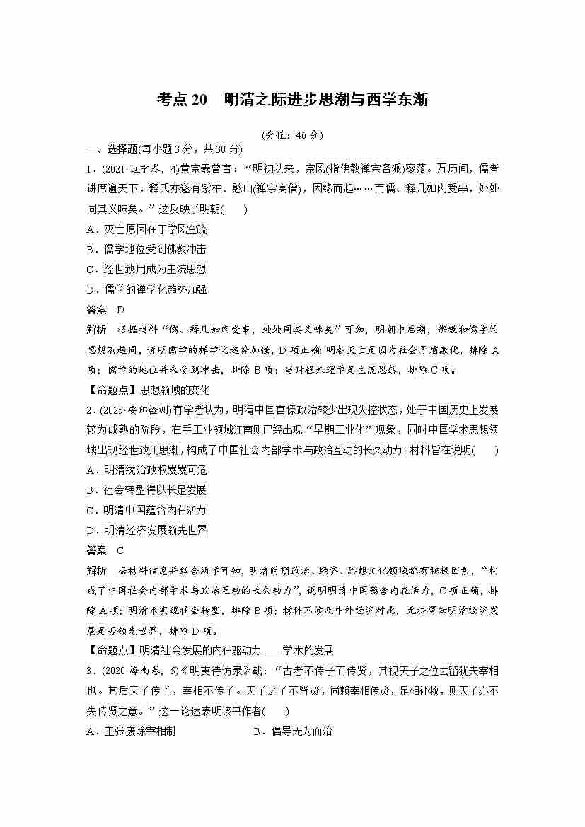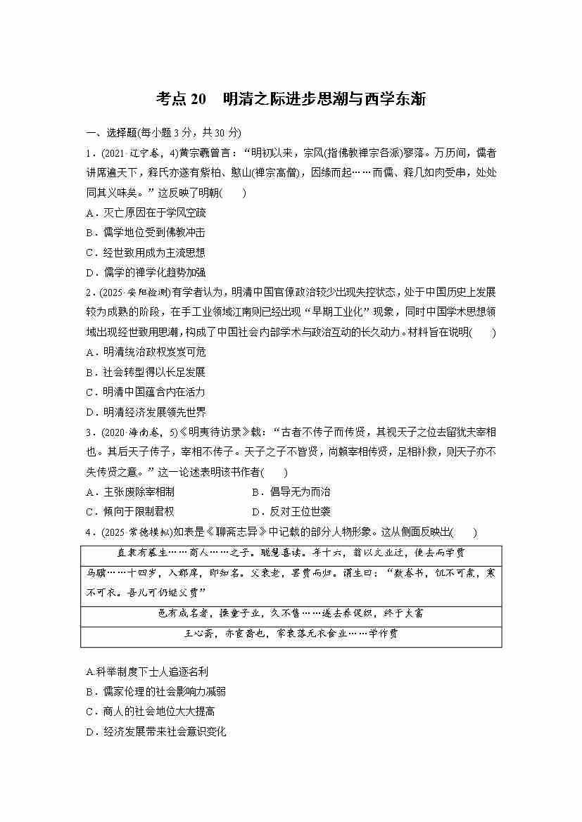 考点20 明清之际进步思潮与西学东渐(教师版)