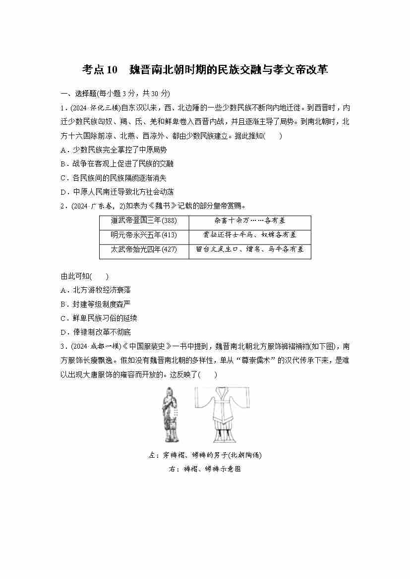 考点10 魏晋南北朝时期的民族交融与孝文帝改革(学生版)