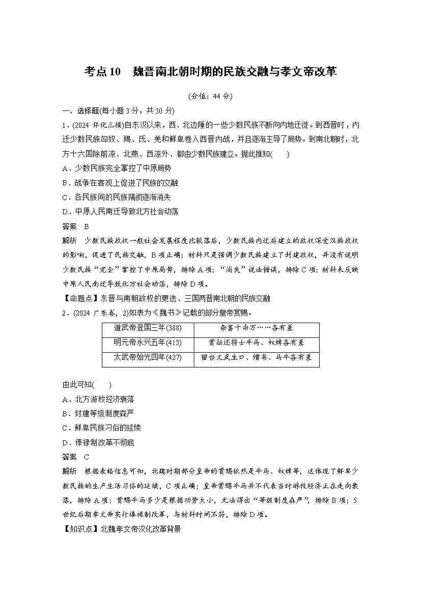 考点10 魏晋南北朝时期的民族交融与孝文帝改革(教师版)