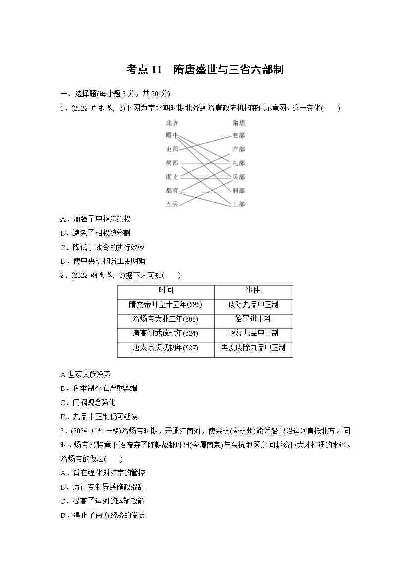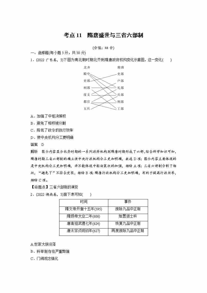 考点11 隋唐盛世与三省六部制(教师版)