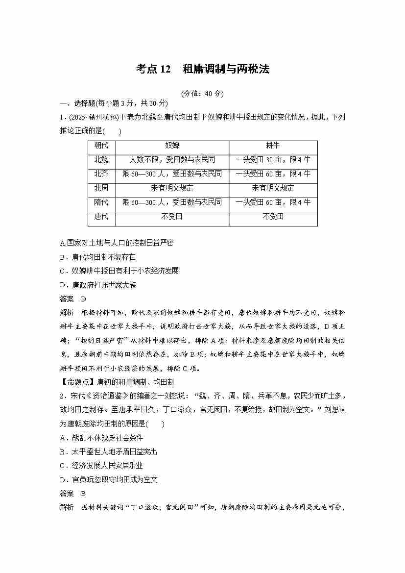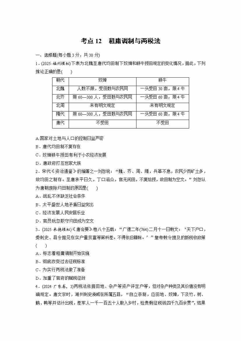 考点12 租庸调制与两税法(教师版)