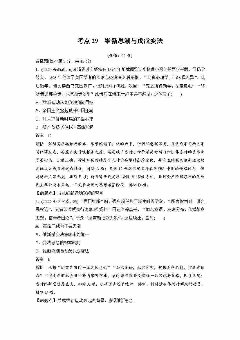 考点29 维新思潮与戊戌变法(教师版)