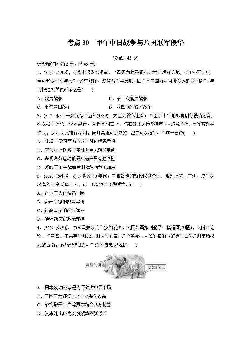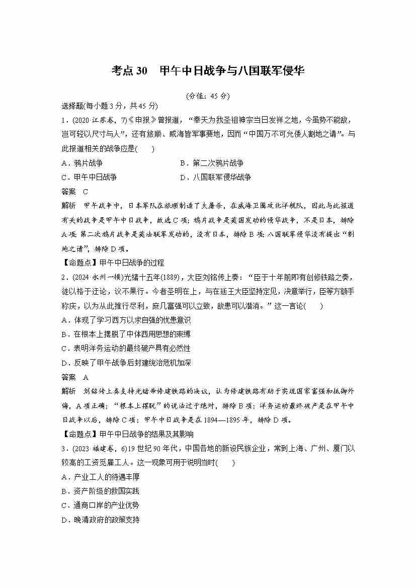 考点30 甲午中日战争与八国联军侵华(教师版)