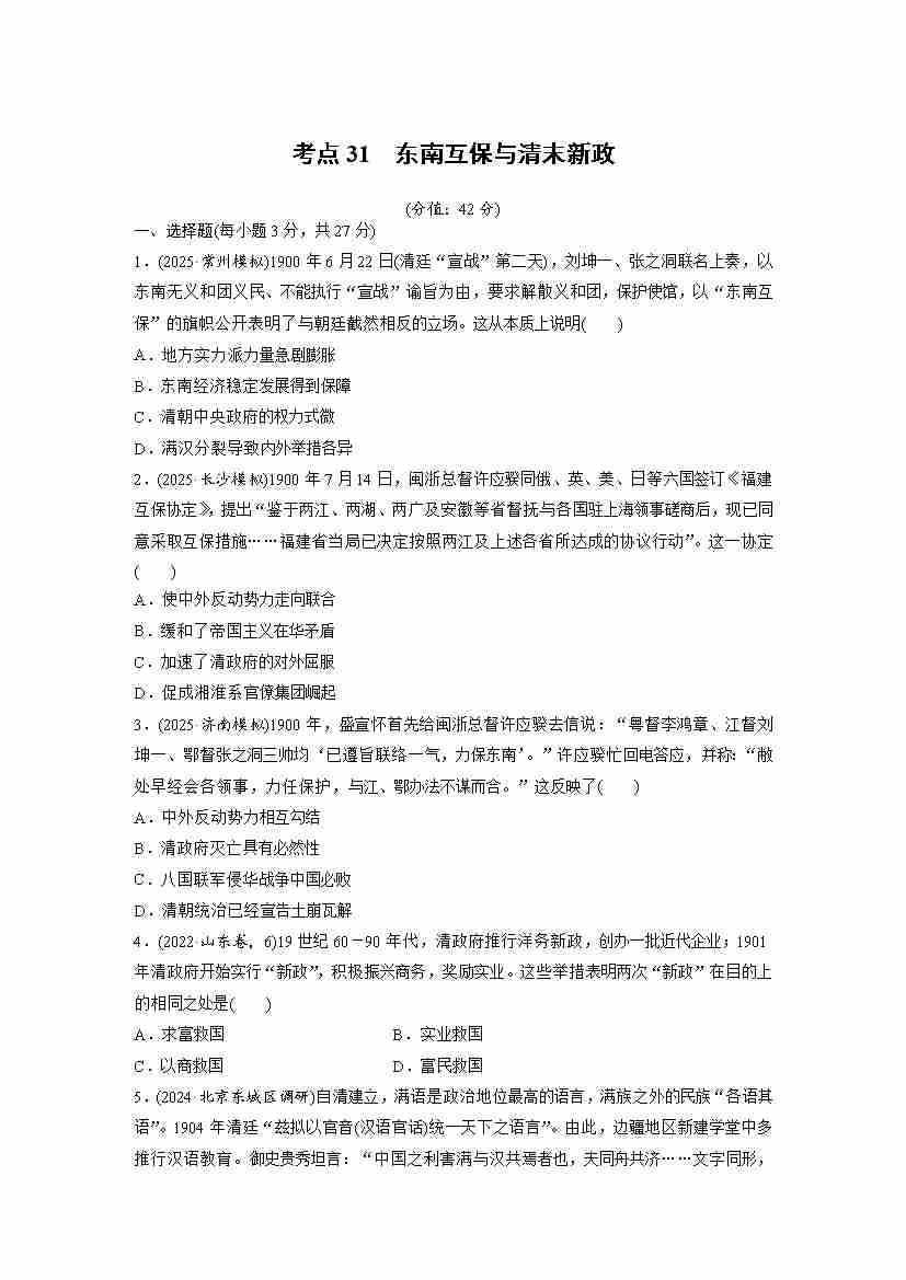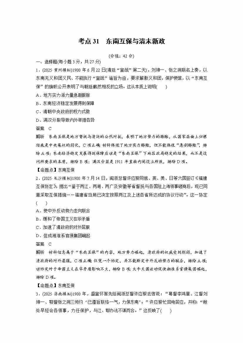 考点31 东南互保与清末新政(教师版)