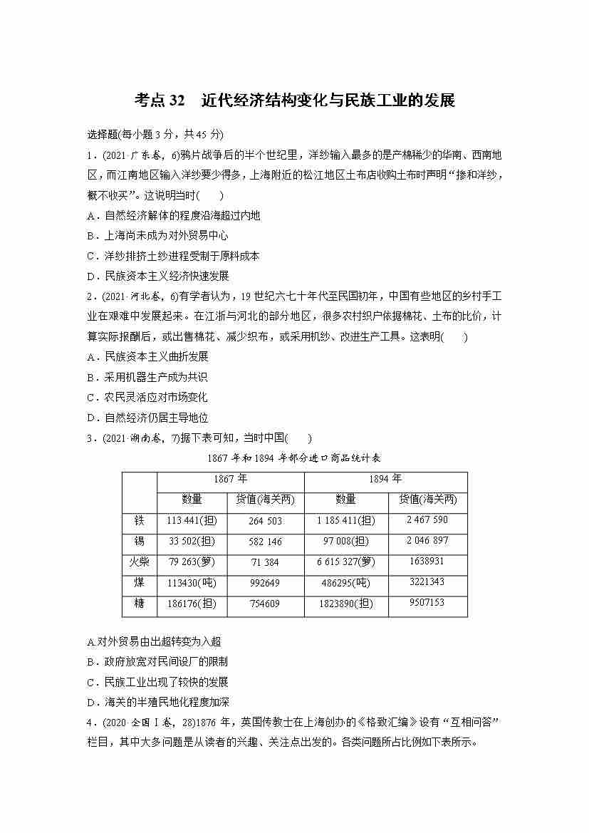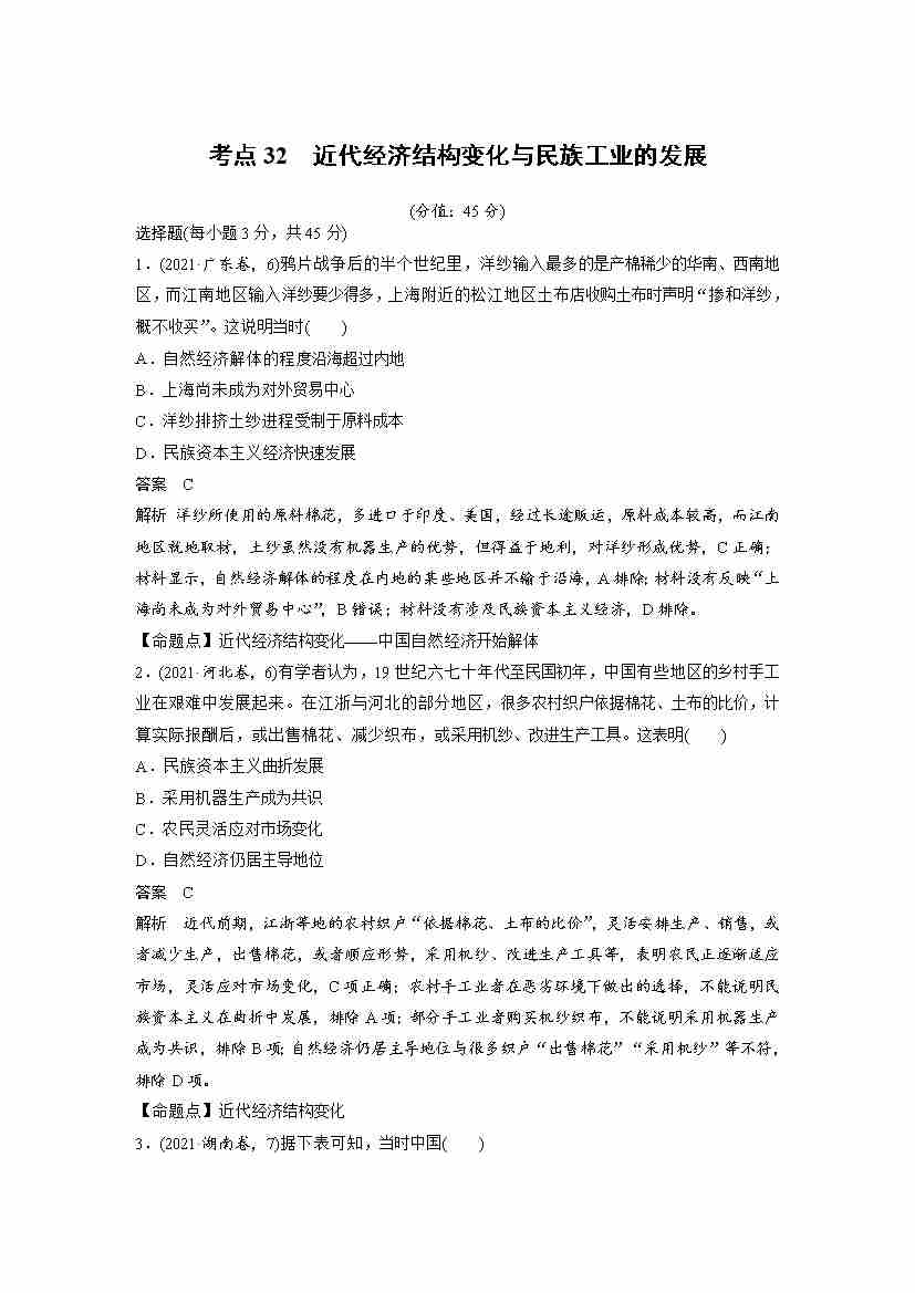 考点32 近代经济结构变化与民族工业的发展(教师版)