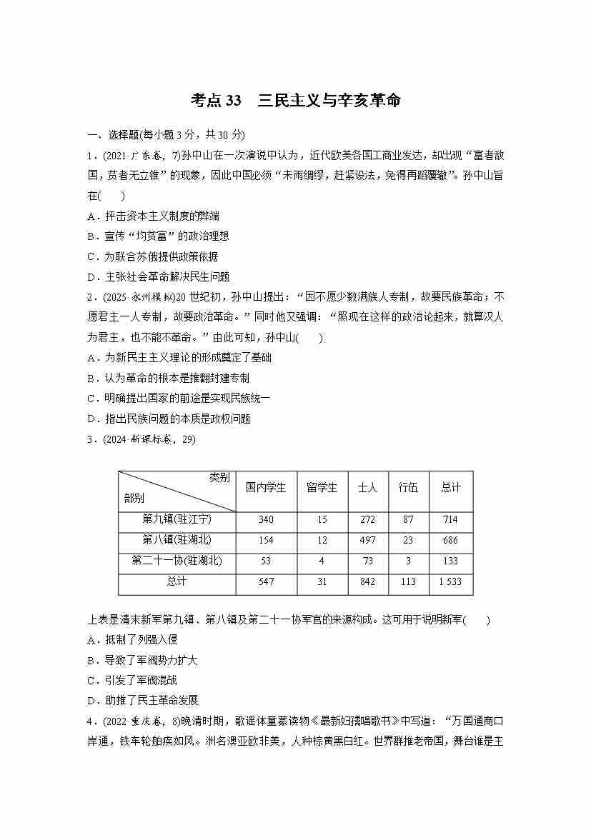 考点33 三民主义与辛亥革命(学生版)