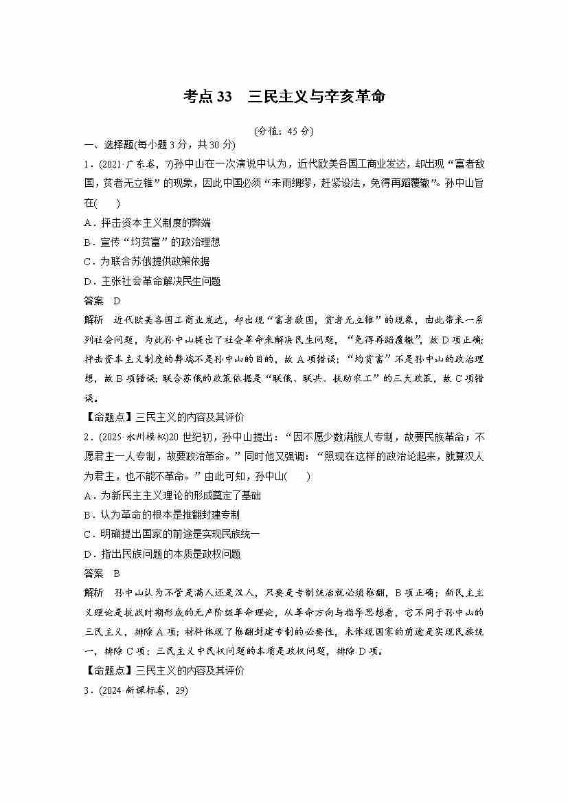 考点33 三民主义与辛亥革命(教师版)