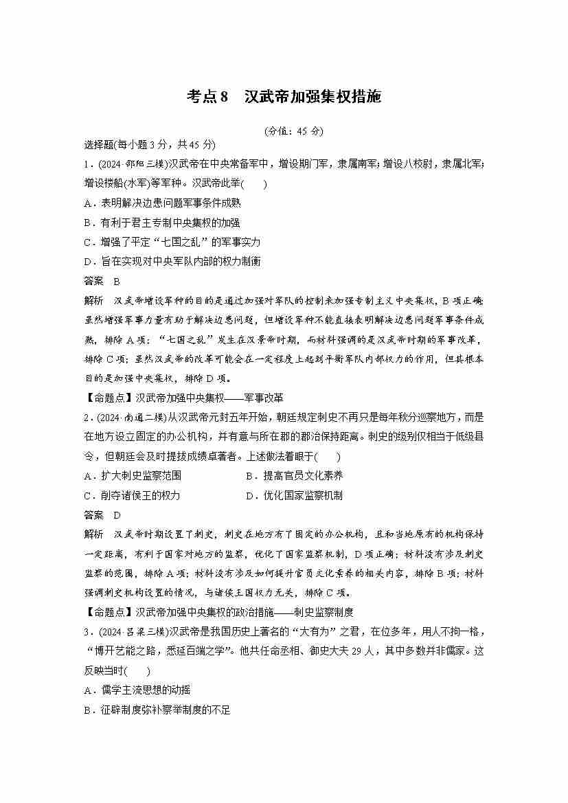 考点8 汉武帝加强集权措施(教师版)
