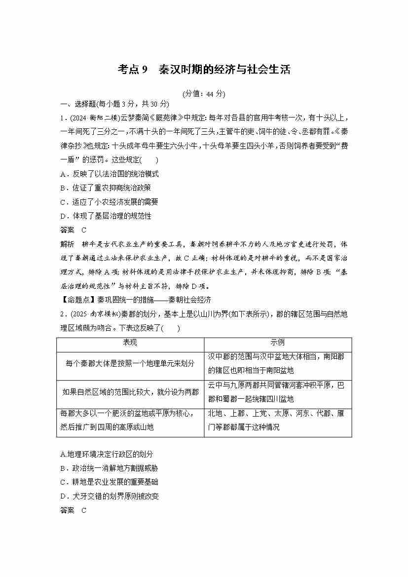 考点9 秦汉时期的经济与社会生活(教师版)