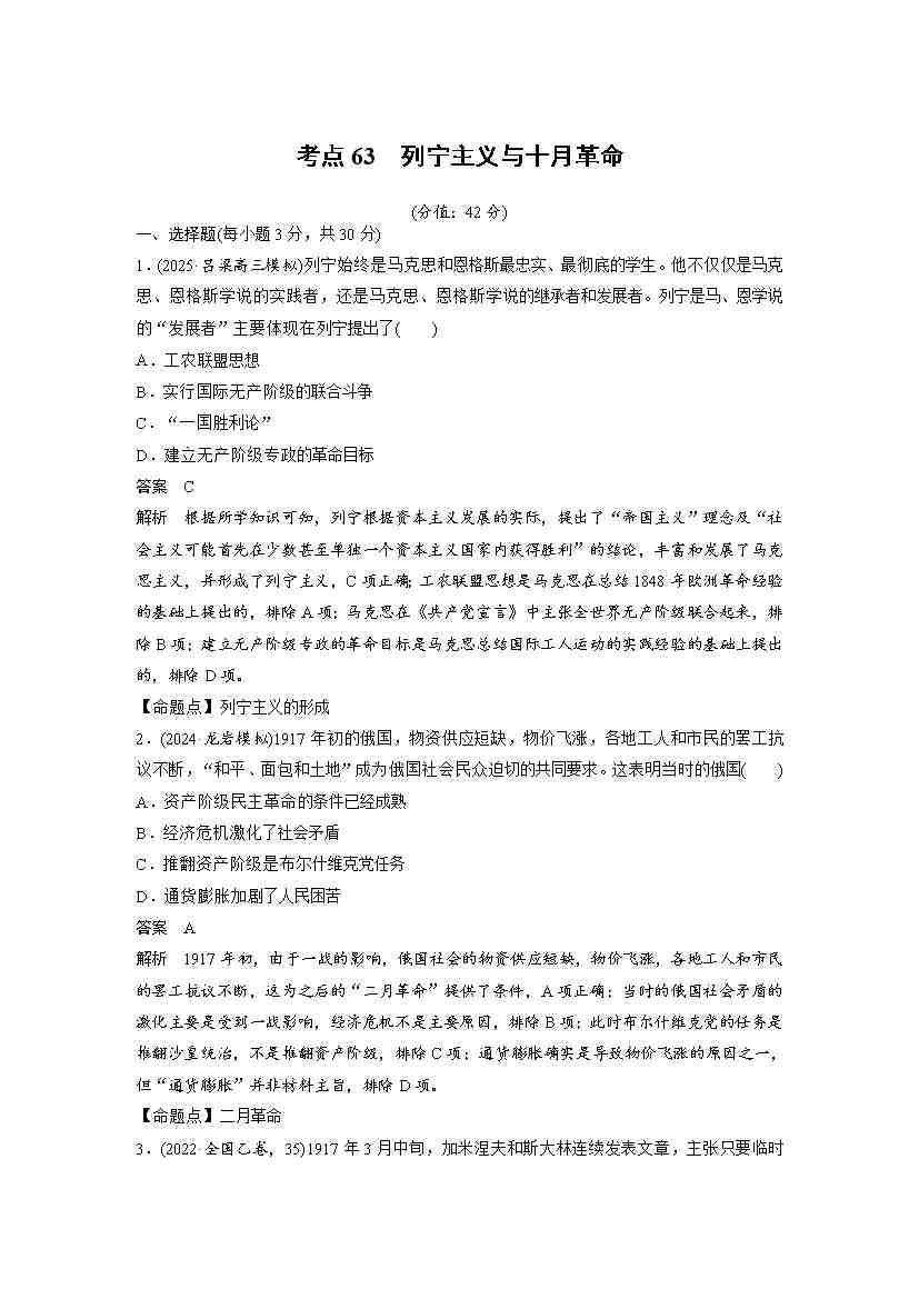 考点63 列宁主义与十月革命(学生版)
