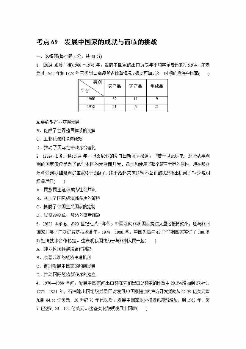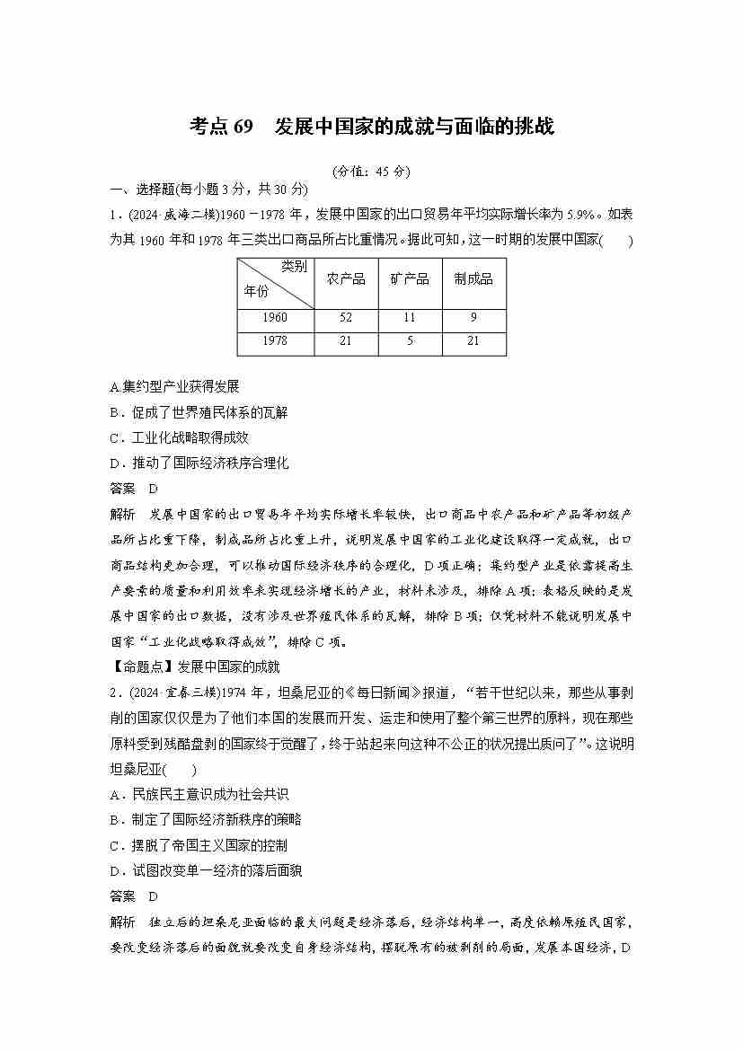 考点69 发展中国家的成就与面临的挑战(教师版)
