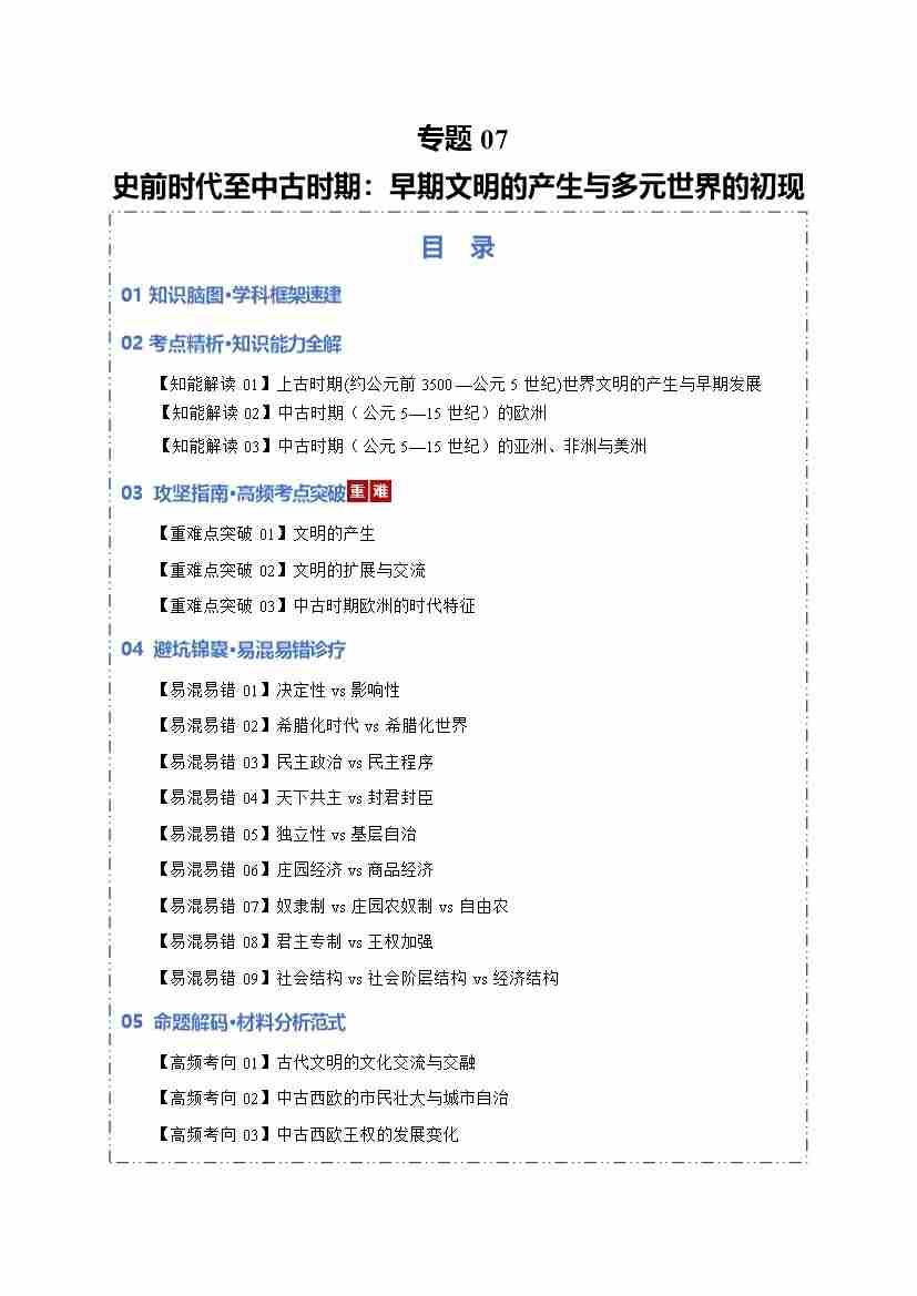 专题07 史前时代至中古时期:早期文明的产生与多元世界的初现(知识清单)(全国通用)2026年高考历史一轮复习讲练测