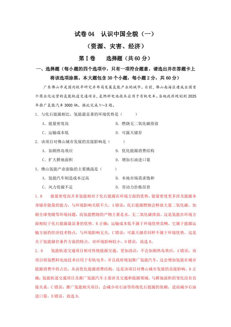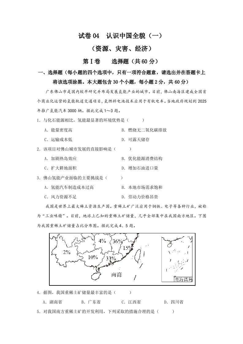试卷04认识中国全貌(一)(资源、灾害、经济).学生版