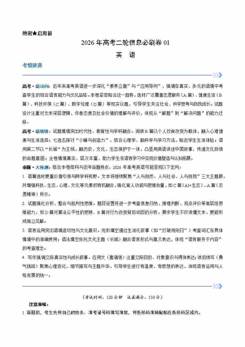 高考英语二轮信息必刷卷01(广东专用)(考试版)