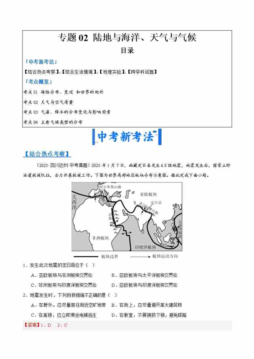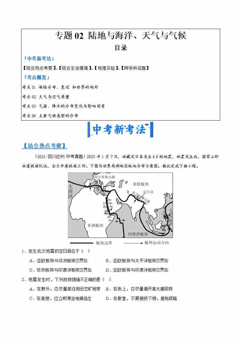 专题02 陆地与海洋、天气与气候(全国通用)(第01期)(原卷版)