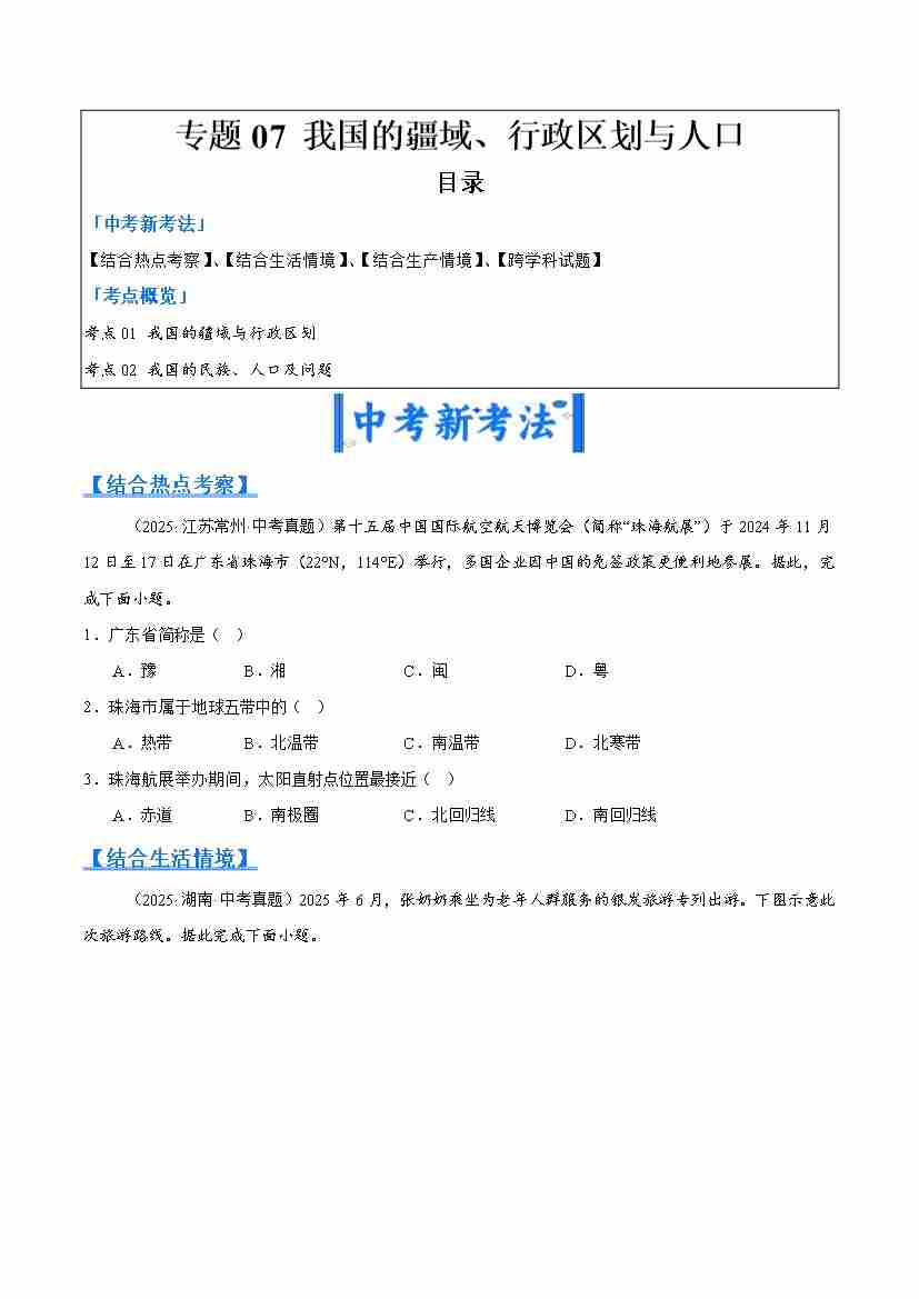 专题07 我国的疆域、行政区划与人口(全国通用)(第01期)(解析版)
