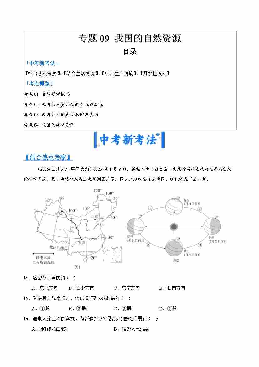 专题09 我国的自然资源(全国通用)(第01期)(原卷版)