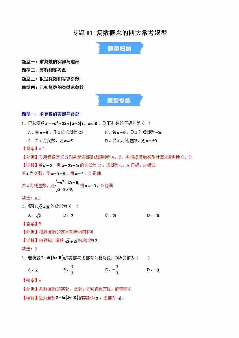 专题01 复数概念的四大常考题型(高效培优专项训练)(解析版)