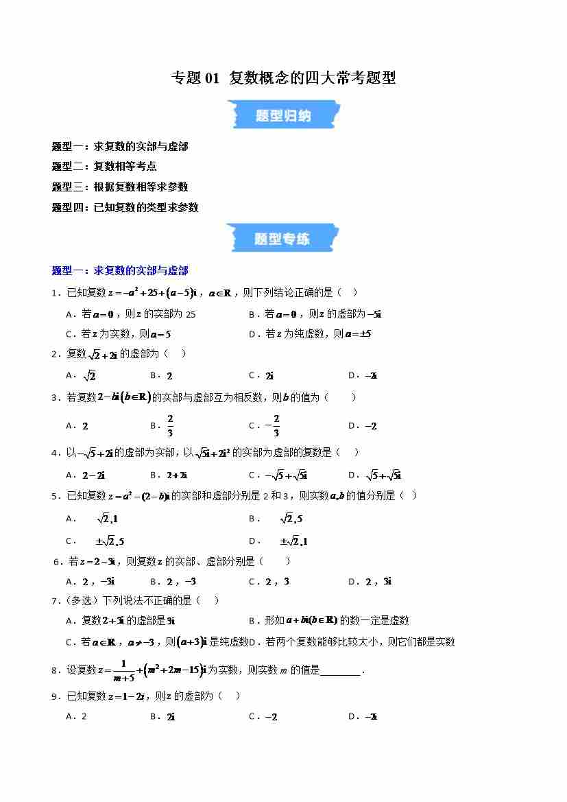 专题01 复数概念的四大常考题型(高效培优专项训练)(试题版)
