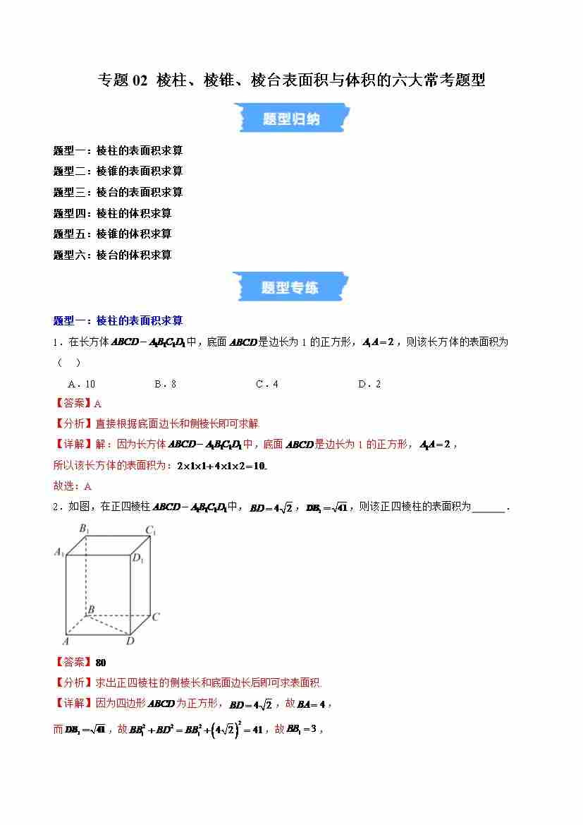专题02 棱柱、棱锥、棱台表面积与体积的六大常考题型(高效培优专项训练)(解析版)