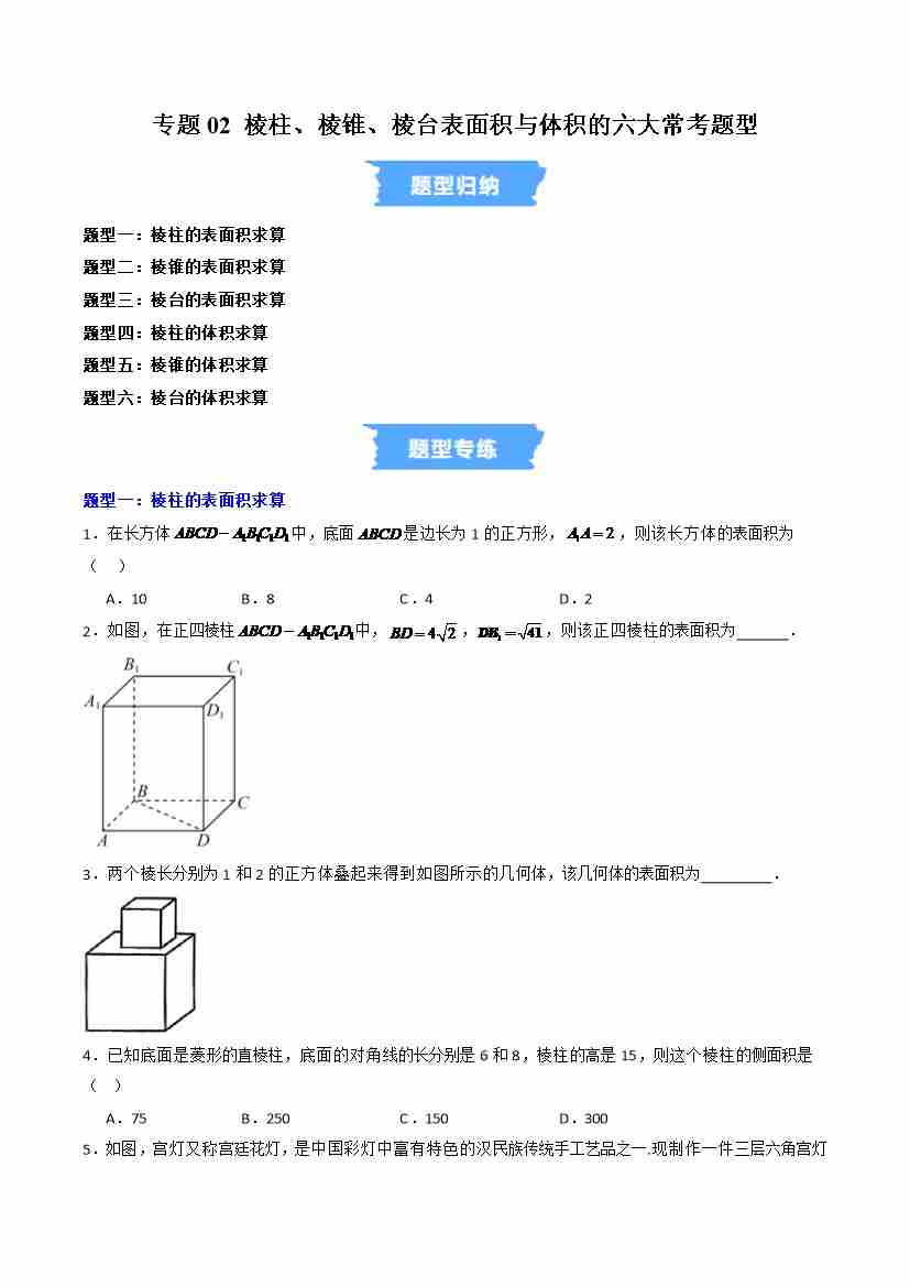 专题02 棱柱、棱锥、棱台表面积与体积的六大常考题型(高效培优专项训练)(试题版)
