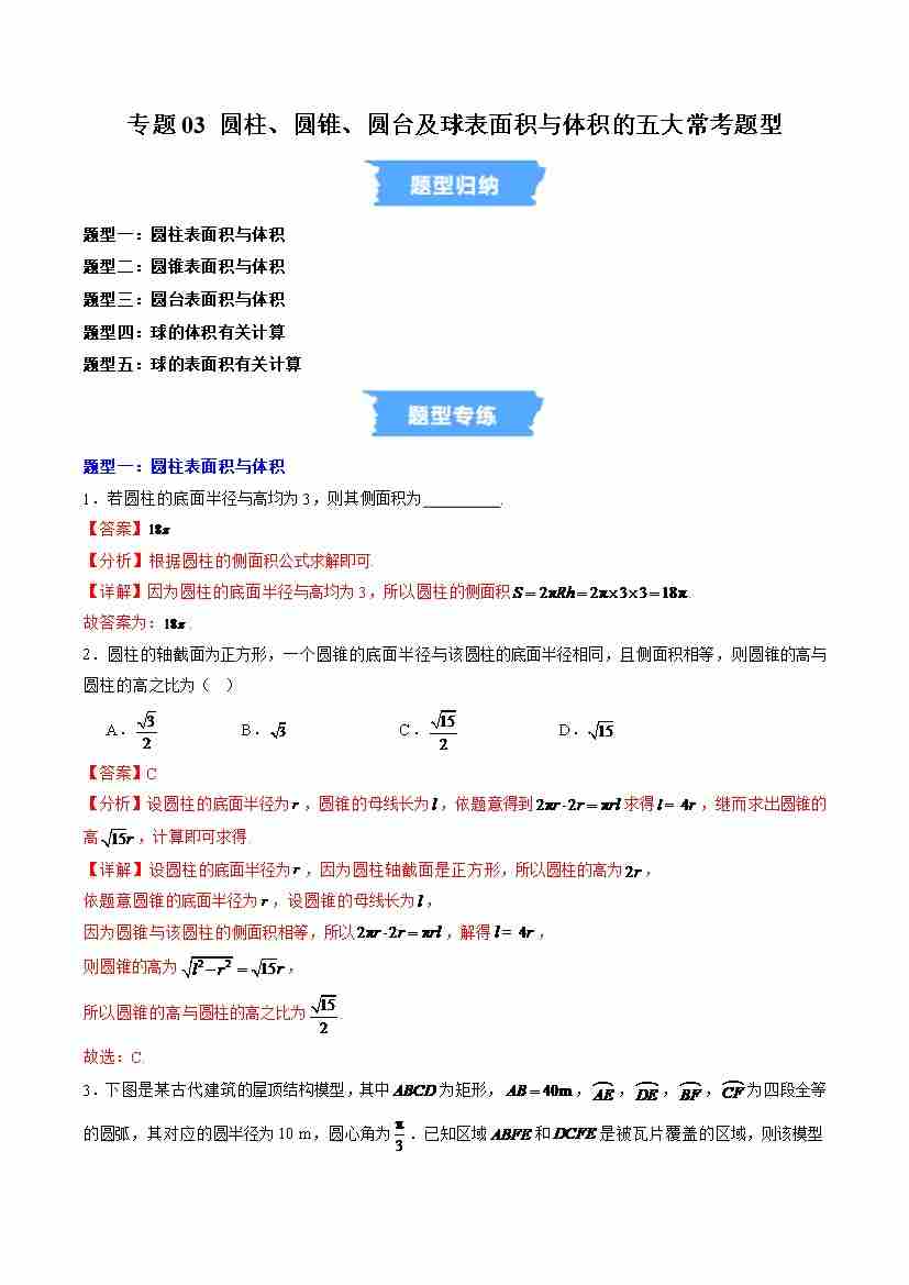 专题03 圆柱、圆锥、圆台及球表面积与体积的五大常考题型(高效培优专项训练)(解析版)