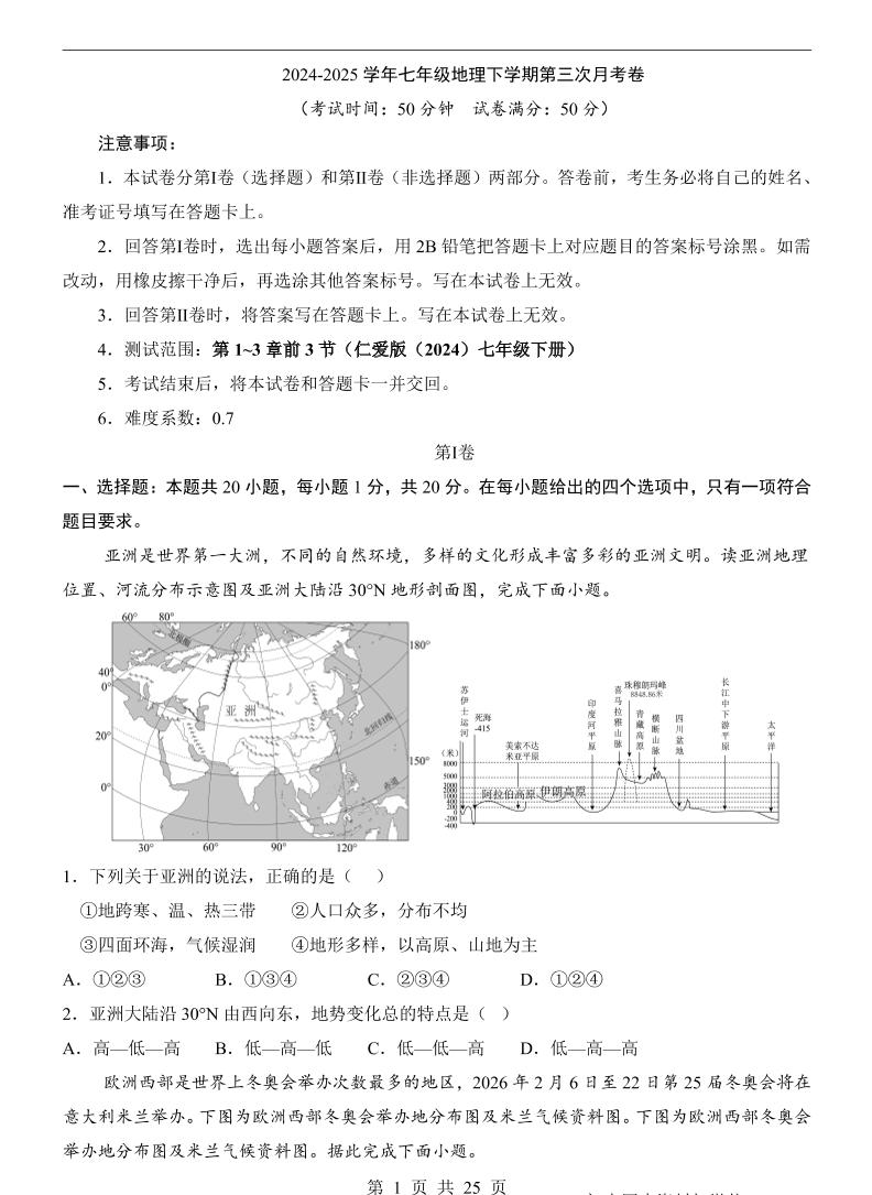 【仁爱】7下地理第3次月考【第1~3单元第3节】