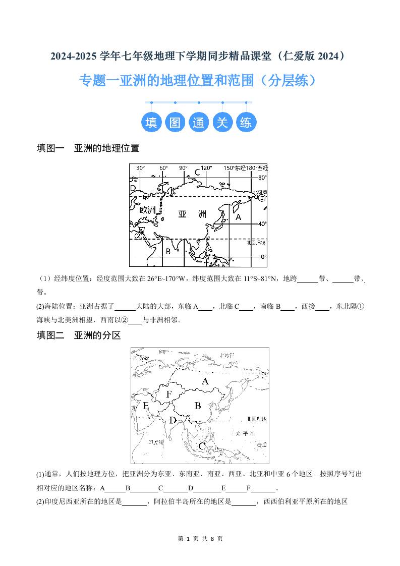 【单元1】专题1 亚洲的地理位置和范围(分层练)(原卷版)
