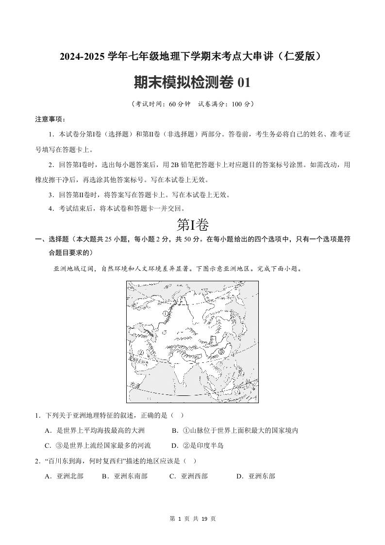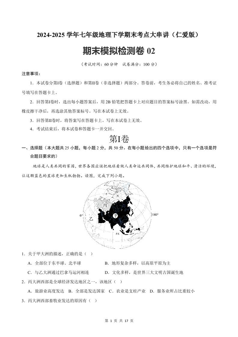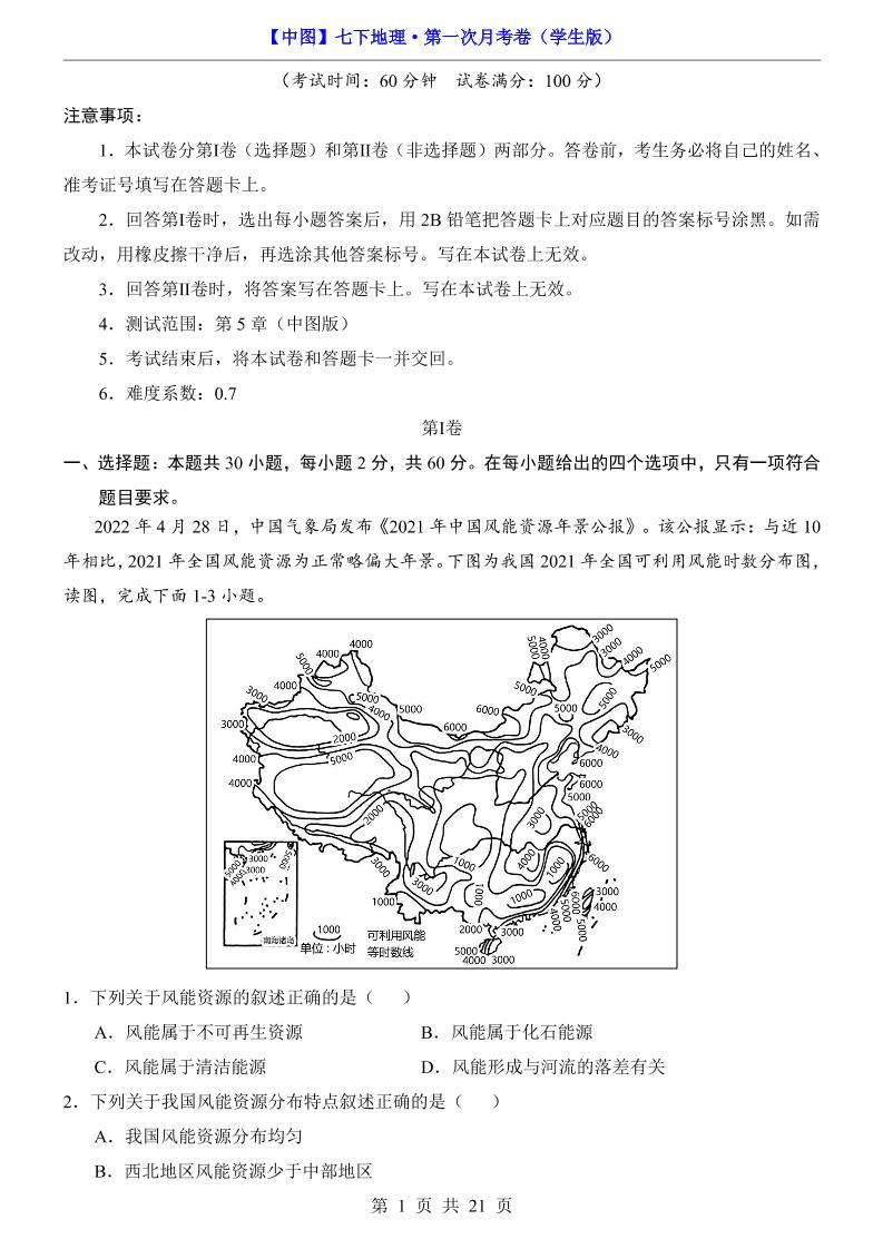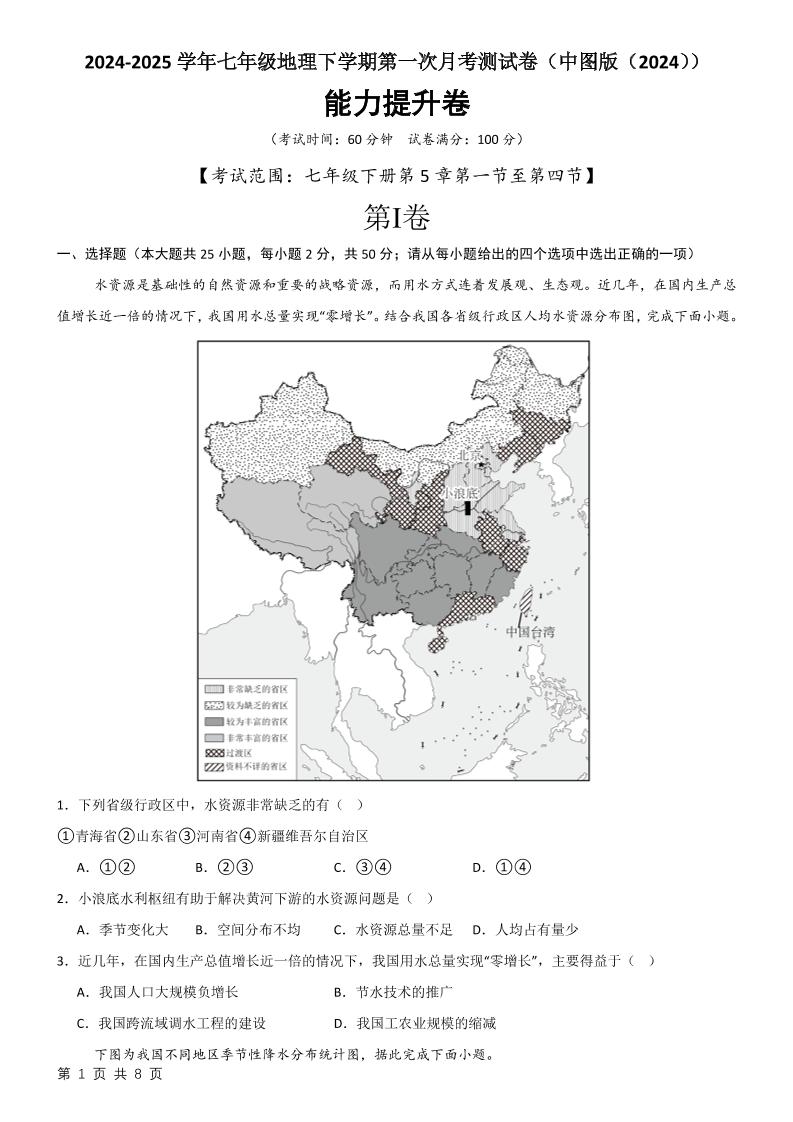 2024-2025学年七年级地理下学期第一次月考测试卷(中图版(2024))(原卷版)