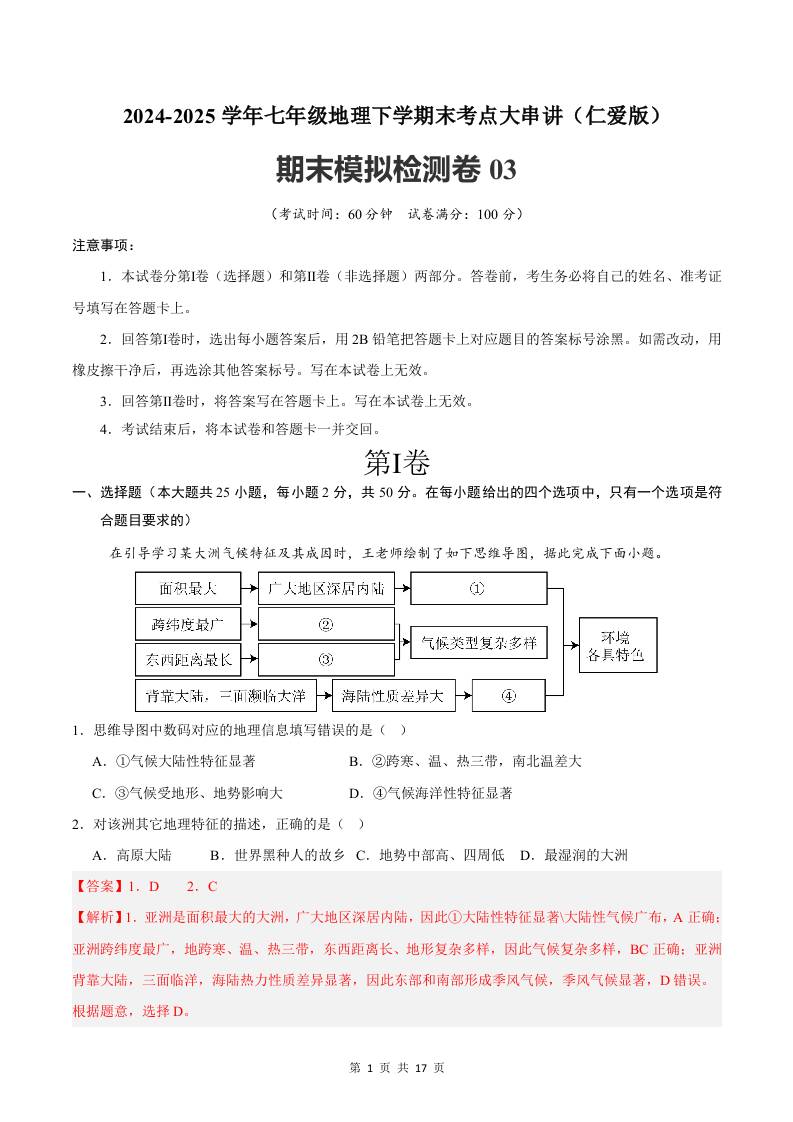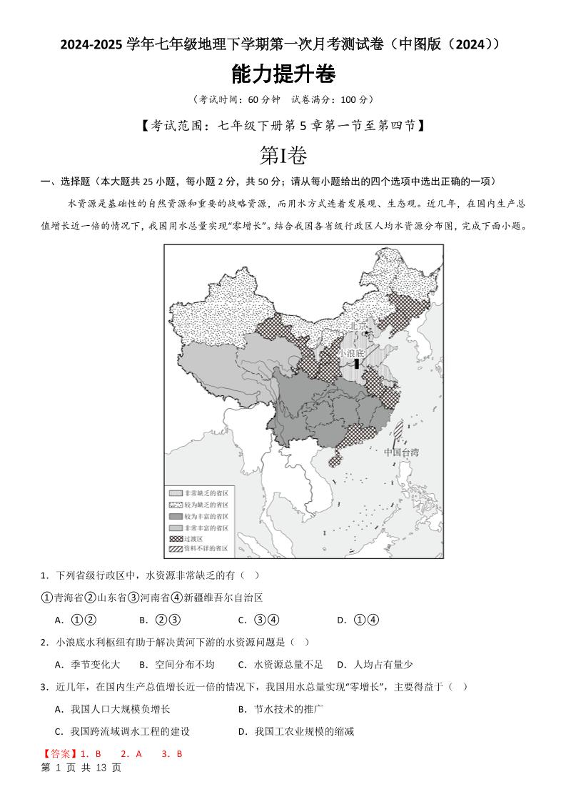 2024-2025学年七年级地理下学期第一次月考测试卷(中图版(2024))(解析版)