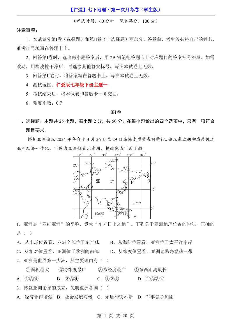 【仁爱】7下地理第1次月考【主题1】
