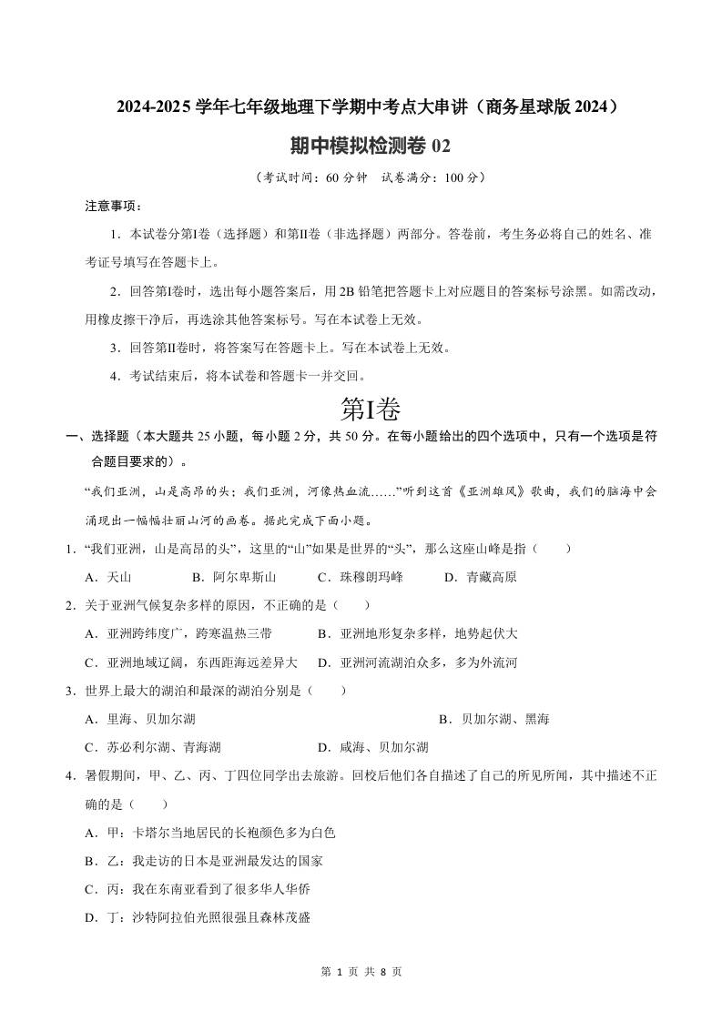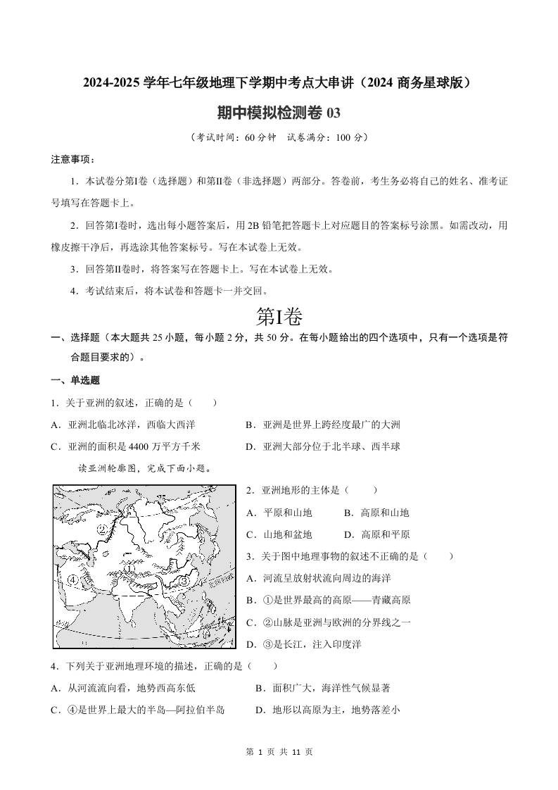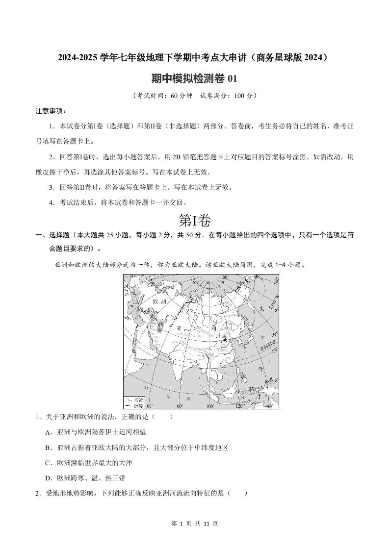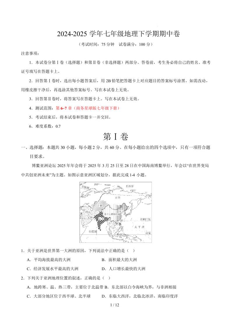 (星球版)七年级地理期中卷(考试版)【测试范围:第6~7章】